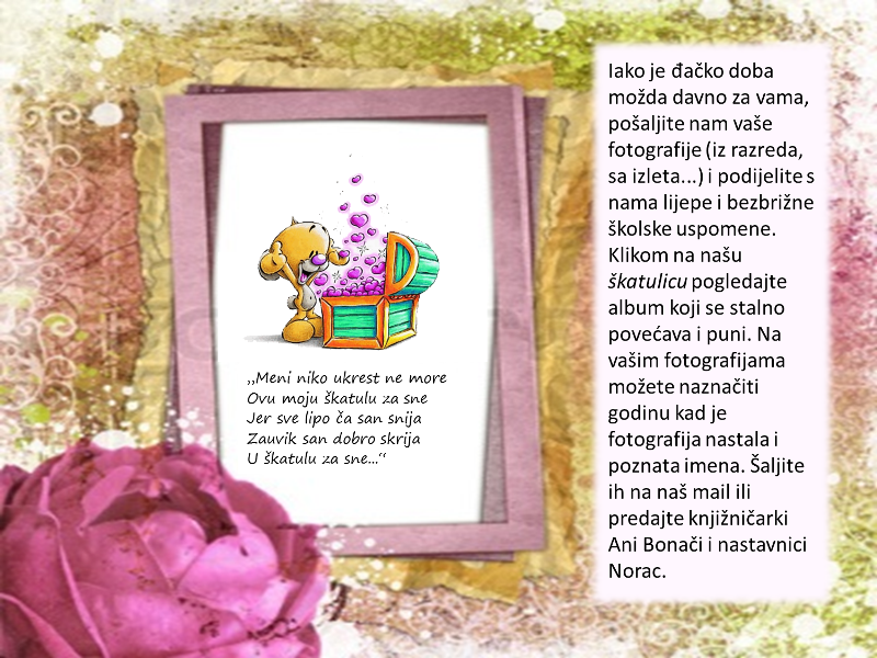 Ove dvije knjige vrijedno je ispisivao ravnatelj i učiteljice još od osnutka škole te su u njima zabilježeni svi važni događaji, proslave, nagrade, radovi, a posebno je zanimljivo pratiti koliko se iz godine u godinu u školu ulagalo i koliko se ona mijenjala i uljepšavala. Proučite mnoštvo fotografija, sigurno ćete pronaći nešto poznato što će vas nasmijati ili raznježiti. Kada prolistate ove stranice, pokažite ih svojim roditeljima i prijateljima, pokušajte pronaći poznata lica svojih starih učitelja i nastavnika, nasmijte se smiješnim frizurama i uživajte! Možda vas to potakne da u nekoj staroj kutiji pronađete kakvu školsku fotografiju, a ako je nađete obvezno nam je pošaljite da je objavimo u našoj ''Škatuli za sne''.