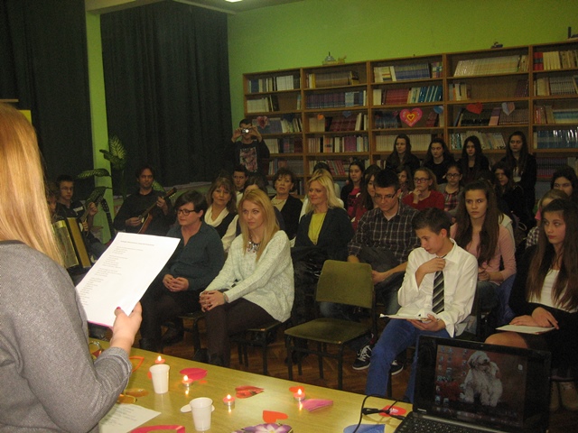 U želji da pokažemo drukčiju interpretaciju Dana ljubavi, okupili smo se u školskoj knjižnici večer uoči Valentinova i odlučili proslaviti ljubav na naš način. Tresle su se police i lektire, kao i zainteresirana publika, pred antologijskim stihovima ljubavne poezije. Nakon uvodnih riječi i pozdrava voditelja Tee Dević i Sandra Šarića (8.d) uslijedili su krasnoslovi sa svih strana svijeta, a sve je bilo prožeto ugodnim zvukovima Školskog instrumentalnog sastava pod vodstvom nastavnika Zlatka Norca. Uživali smo uz zvukove mandoline i gitare u pomno odabranim melodijama koje je nastavnik izveo uz pomoć Karle Gorete (5.a), Atina Franića (8.b) i Mateja Dražića Balova (8.d).