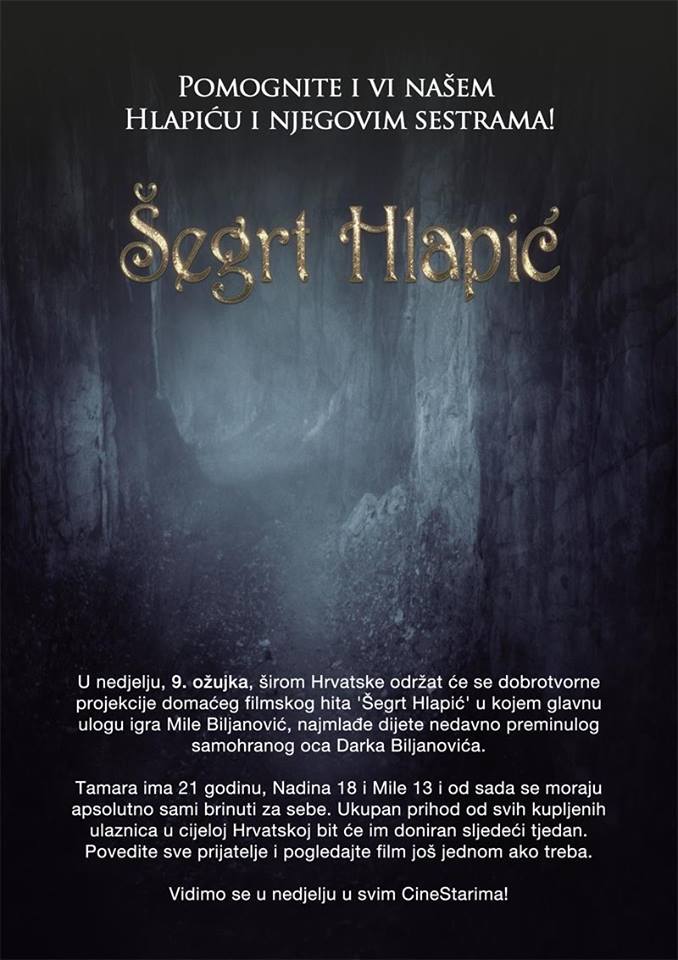 U nedjelju 9. ožujka u kinima diljem Hrvatske održava se dobrotvorna projekcija filmskog hita Šegrt Hlapić u kojem glavnu ulogu igra Mile Biljanović. Nedavnim gubitkom tate, Mile i njegove sestre ostali su sami i sada trebaju podršku svih ljudi dobre volje kako bi ostali zajedno i ostvarili svoje snove.