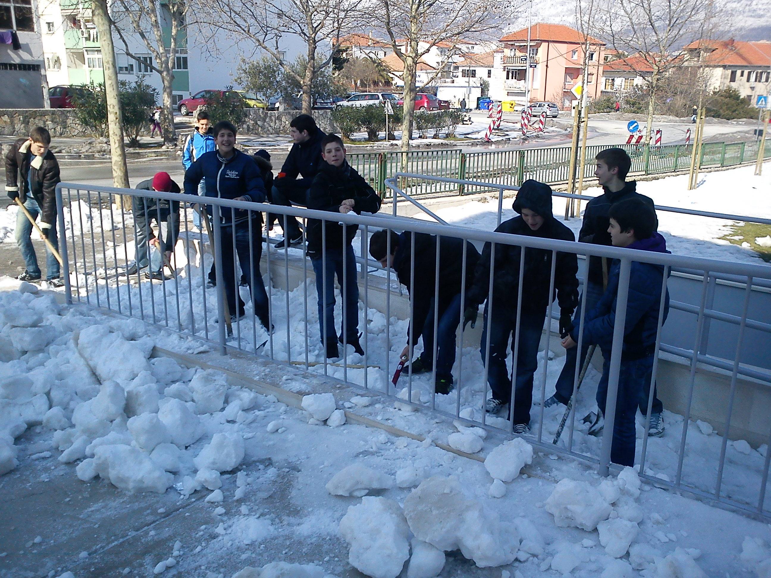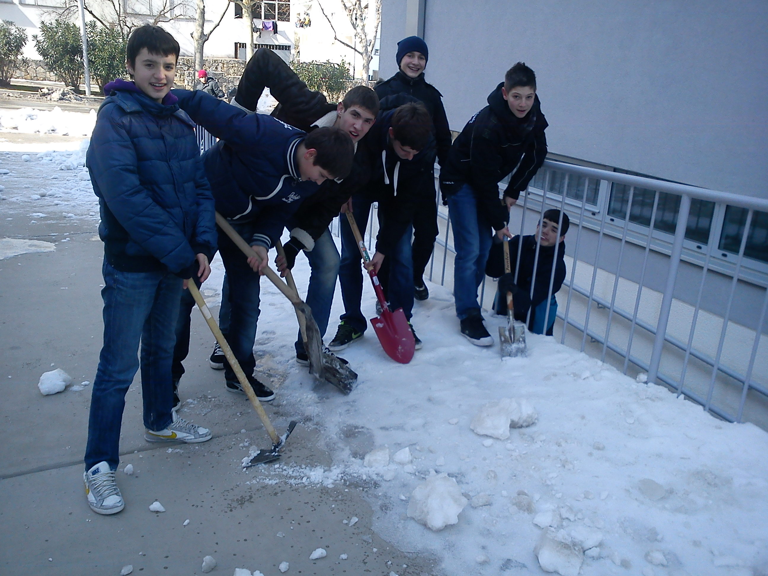 Nakon odmora od 11 dana, učenici osmih razreda vrijedno su čistili prilaz dvorani. Za vrijeme nastave uspijeli su očistiti sav snijeg i tako olakšali drugim učenicima pristup dvorani.