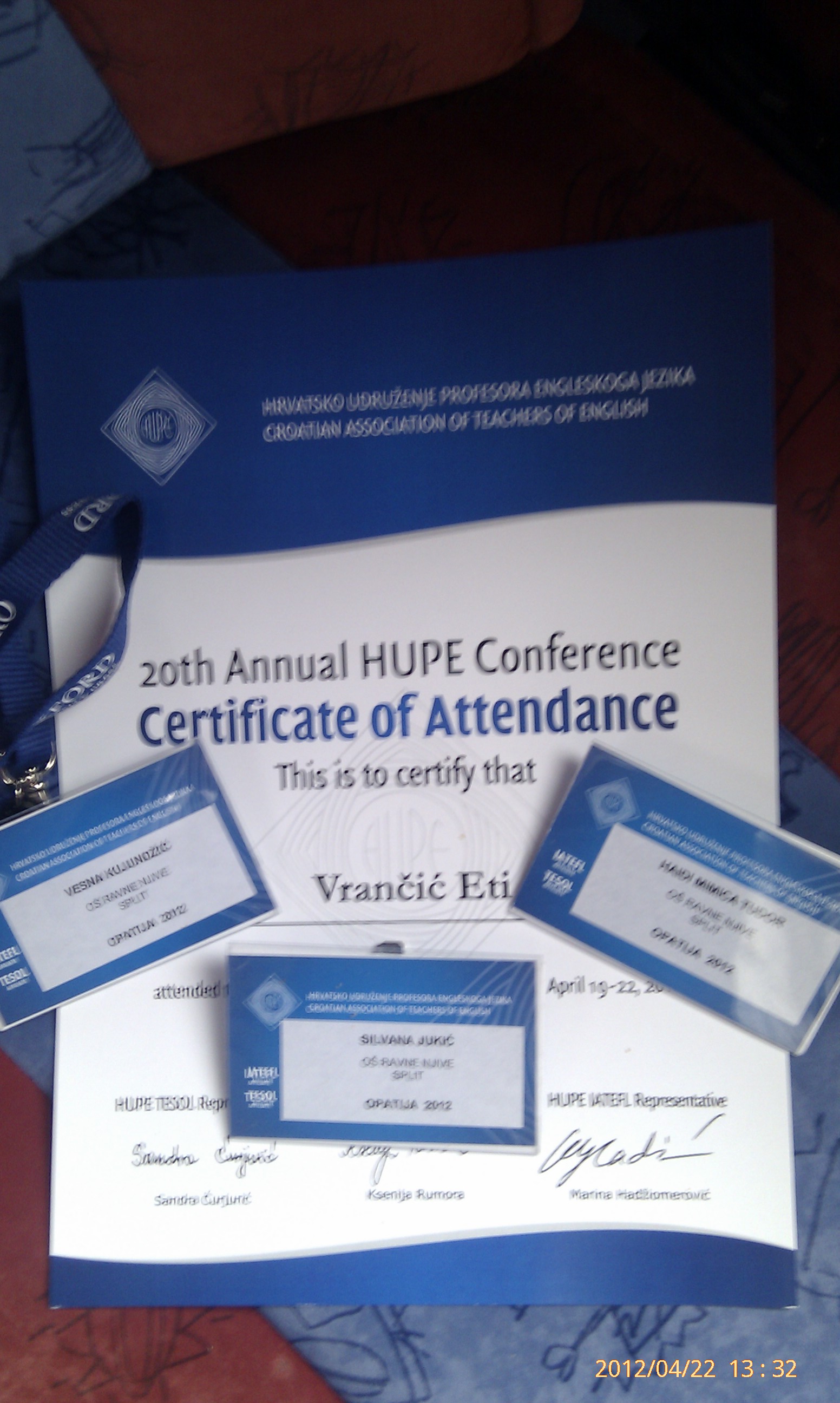 But, the four of us, Ms Vrančić, Ms Kujundžić, Ms Tudor and Ms Jukić, went to Opatija to attend the 20th HUPE (Croatian Association of Teachers of English) conference in Opatija.