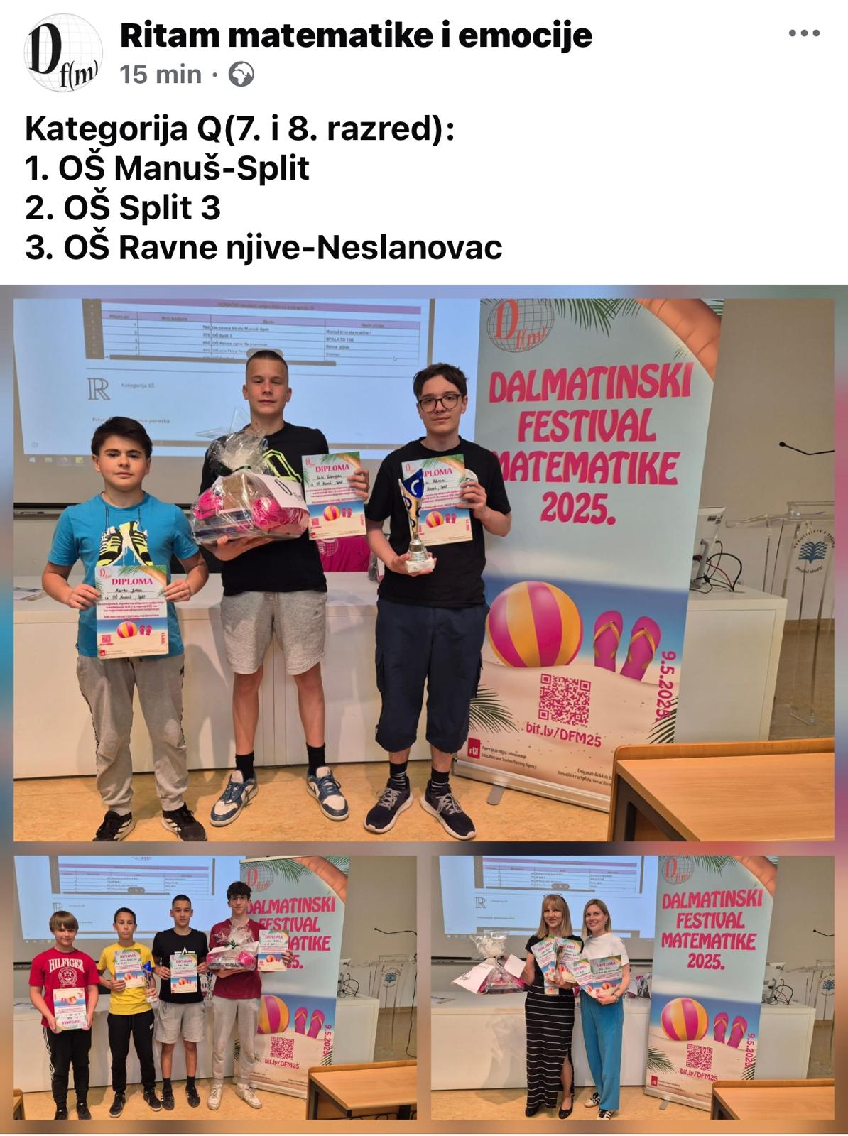 Na Dalmatinskom festivalu matematike, održanom 9.svibnja 2025. na Sveučilišnom odjelu za stručne studije Sveučilišta u Splitu, sudjelovalo je 60 škola s oko 180 ekipa i 720 učenika.