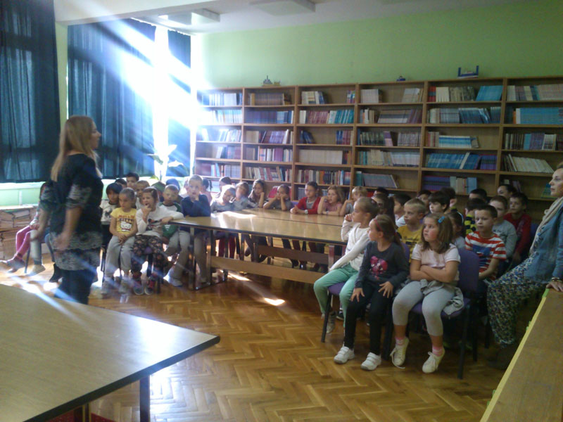 Knjižničarka Ana Bonači u školskoj je knjžnici ugostila učenike 1.c i 1. e razreda s njihovim učiteljicama. Radoznale je prvašiće upoznala s pojmovima školska knjižnica, knjižničar, gradska knjižnica, posudba knjiga, straničar te objasnila koja je važnost knjižnice u njihovom školovanju.