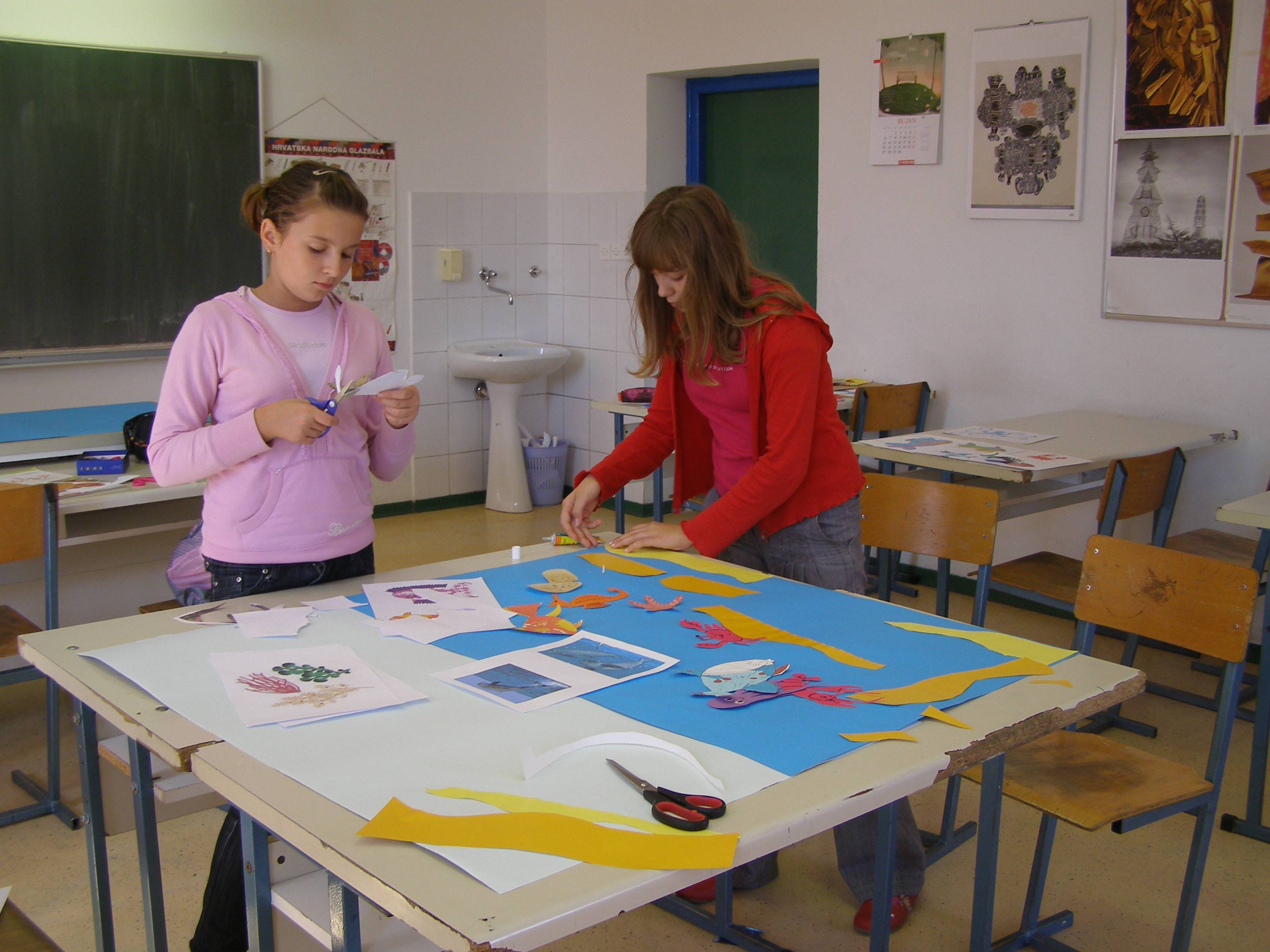 Foto. 1. Učenici na satu likovne grupe izrađuju plakat povodom Dana mora.