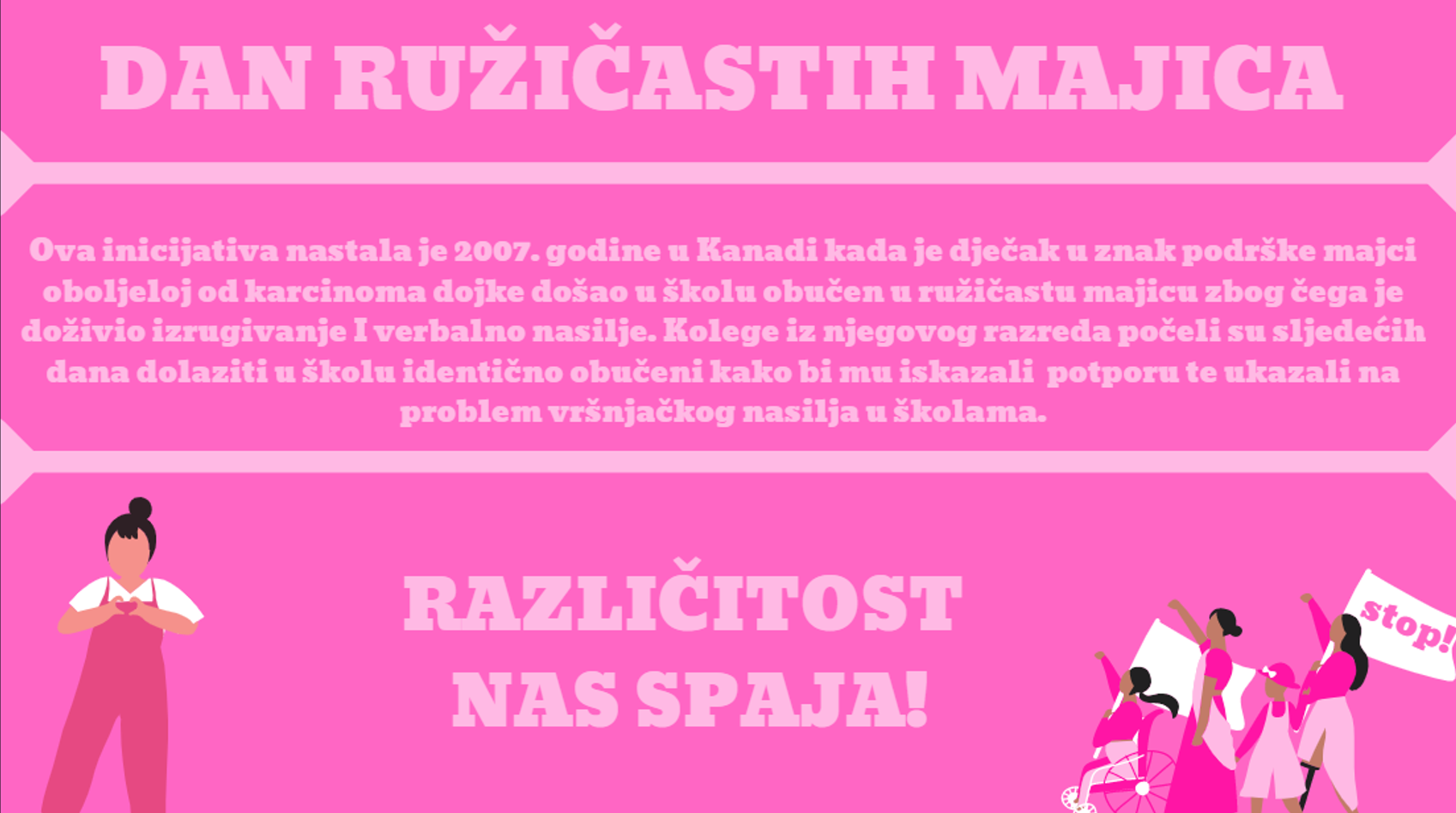 Učenici 6. razreda dogovorili su se da će u srijedu, 24. veljače i sami obući ružičaste majice i time pokazati da su oni protiv svakog oblika nasilja i pozivaju ostale učenike škole da im se pridruže i obuku ružičastu majicu (ako je imaju).