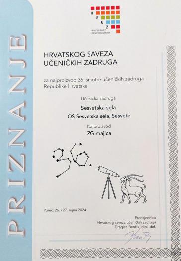 Na 36. Smotri Hrvatskog saveza učeničkih zadruga, koja se održala 25. do 27. rujna u Poreču, naša je škola osvojila nagradu za Najproizvod! ZG majica!