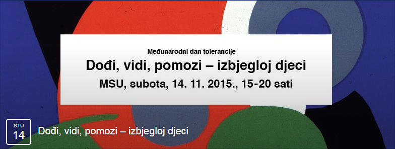Muzej suvremene umjetnosti Zagreb (MSU) i Gradsko društvo Crvenog križa Zagreb u subotu 14. studenoga 2015. godine od 15 do 20 sati obilježavaju Međunarodni dan tolerancije humanitarnom akcijom Dođi, vidi, pomozi – za djecu u izbjegličkoj krizi.