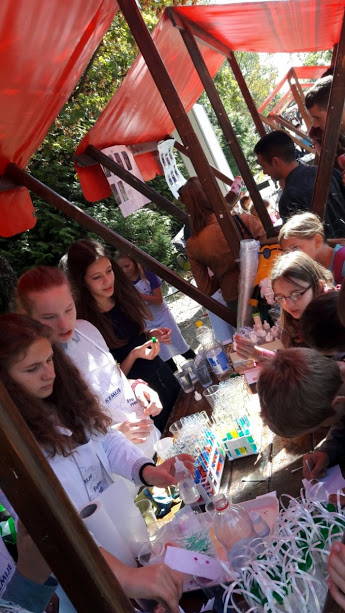 Mi smo imali štand s pokusima iz kemije. Među kojima su bile tajne poruke, lava lampa, vatromet boja i šašave epruvete :). Učenici koji su bili zaduženi za štand uložili su puno truda i znanja kako bi naš štand učinili što zanimljivijim. Njihov se trud isplatio, pa mogu iskreno reći da je naš štand bio najposjećivaniji štand na cijelom pikniku. Osobito su se dobro primale tajne poruke i lava lampe, te smo pod kraj ostali bez epruveta. ![]()