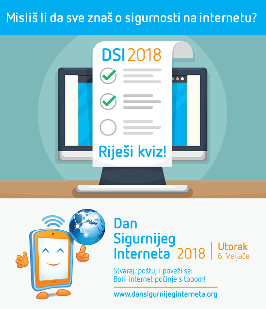 Centar za sigurniji Internet (www.csi.hr) i ove godine sudjeluje u obilježavanju Dana sigurnijeg interneta (#DSI2018) provođenjem niza aktivnosti. Ovogodišnji Dan sigurnijeg interneta se organizira u sklopu projekta „Safer Internet Centre Croatia: Making internet a good and safe place” (2015-HR-IA-0013) kojega sufinancira Europska unija iz programa Department C - Connecting Europe Facility (CEF).