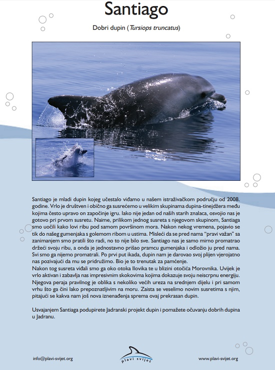 Zajedničkim dogovorom između ponuđenih dupina odlučili smo da ćemo usvojiti dupine po imenu Santiago.