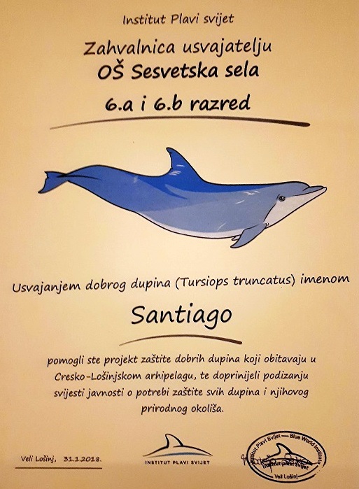Učenici 6. a i 6. b razrednih odjela u sklopu nastave prirode potaknuti učiteljicom Marijanom Magdić odlučili su se usvojiti dobrog dupina.