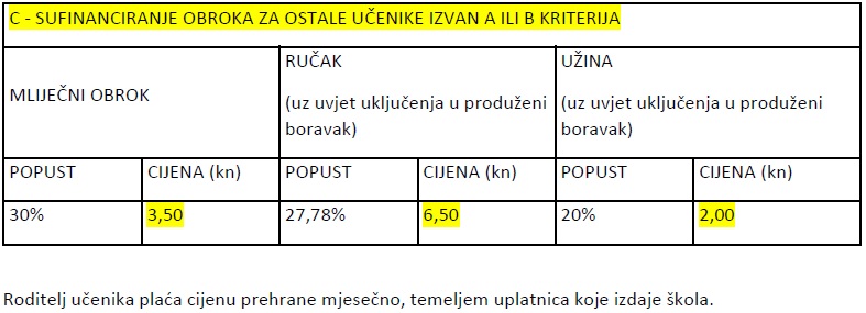 Učenici ostvaruju pravo na sufinanciranje cijene obroka, sukladno utvrđenim kriterijima i mjerilima iz Programa javnih potreba u osnovnoškolskom odgoju i obrazovanju. Razlika sredstava do utvrđene pune cijene besplatnih i sufinanciranih obroka školi se doznačuje iz proračunskih sredstava.