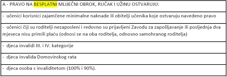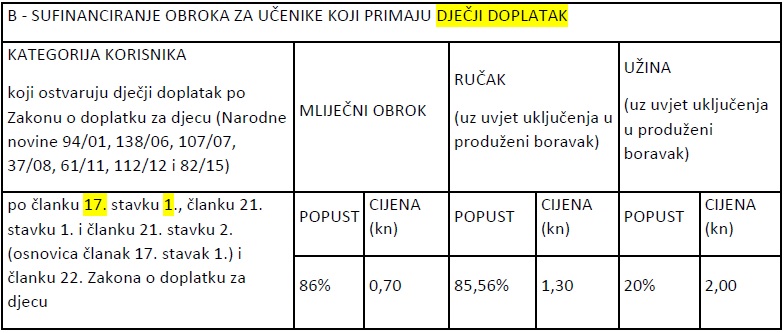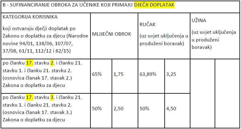 B. Učenici koji primaju dječji doplatak imaju pravo nasufinancirani mliječni obrok, ručak i užinu, uz uvjet da su uključeni u produženi boravak. Sufinanciranje cijene mliječnog obroka ove kategorije korisnika prehrane provodi se na temelju rješenja, uvjerenja ili potvrde HZMO-a o pravu na dječji doplatak na način prikazan u tablici.
