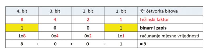Težinski faktor bita – ovisi o položaju bita u nizu (bitnom mjestu). Za svaki bit u nizu, gledajući s desna u lijevo, se udvostručuje (1,2,4,8,16,32,64…).