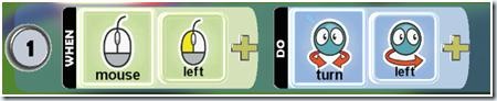 Na slici vidite primjer niza naredbi koje znače: „Kada je na mišu pritisnuta lijeva tipka, okreni se ulijevo“. Na taj način se programira ponašanje različitih objekata.