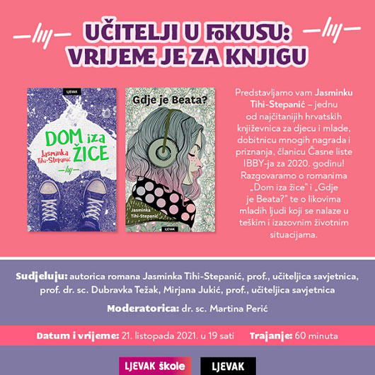 O romanima će, uz samu autoricu Jasminku Tihi-Stepanić, razgovarati prof. dr. sc. Dubravka Težak, Mirjana Jukić, prof., učiteljica savjetnica i dr. sc. Martina Perić, a promocija će se održati 21. listopada s početkom u 19 sati.