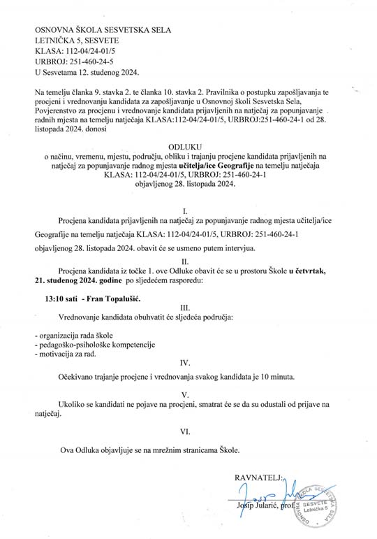 Na temelju članka 9. stavka 2. te članka 10. stavka 2. Pravilnika o postupku zapošljavanja te procjeni i vrednovanju kandidata za zapošljavanje u Osnovnoj školi Sesvetska Sela, Povjerenstvo za procjenu i vrednovanje kandidata prijavljenih na natječaj za popunjavanje radnog mjesta na temelju natječaja KLASA:112-04/25-01/7, URBROJ:251-460-25-1 od 13. listopada 2025. donosi