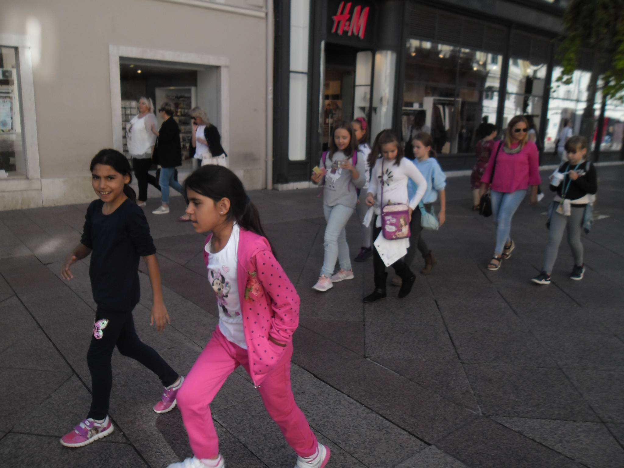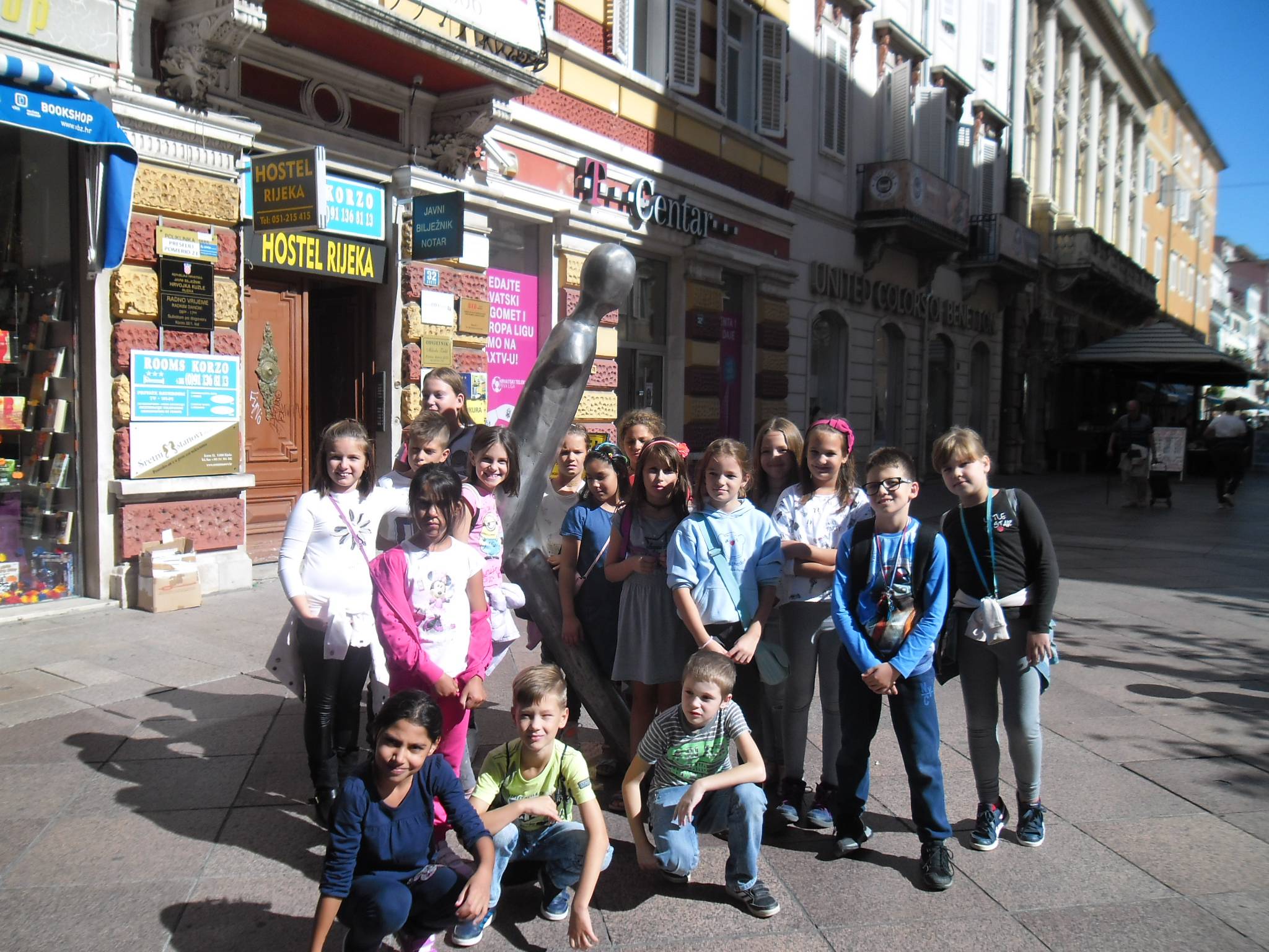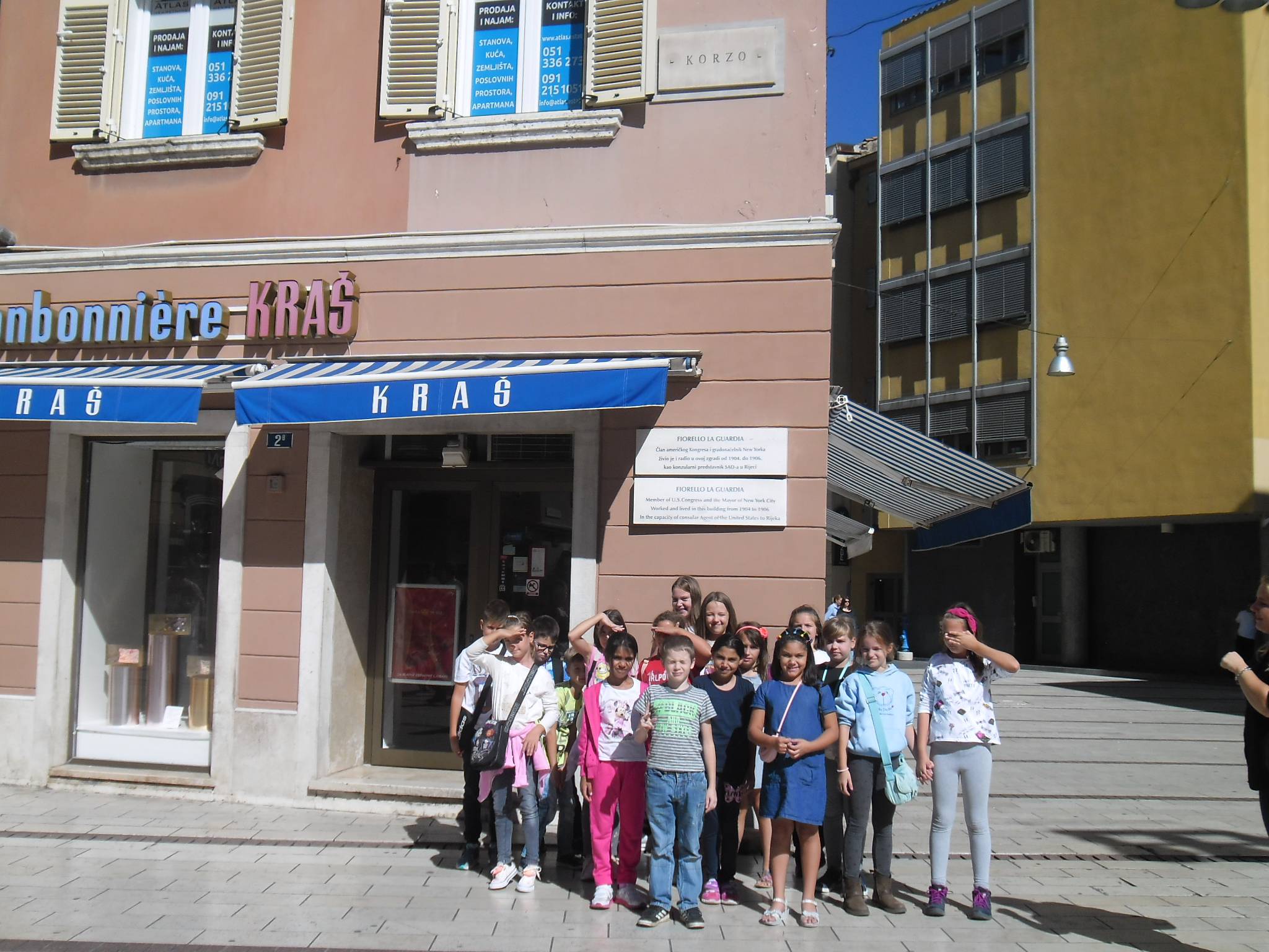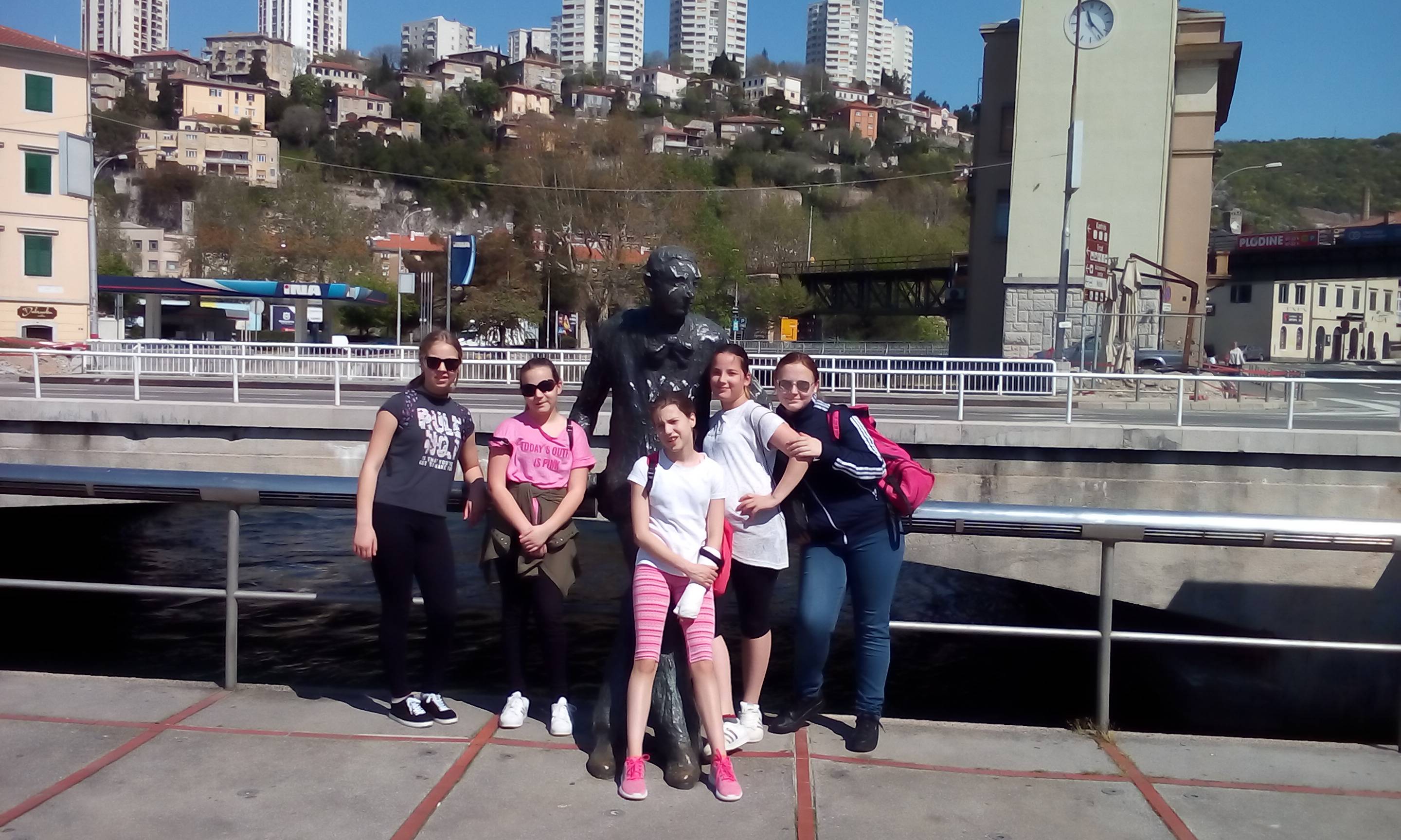 Dvadesetog travnja bilo je okupljanje na Korzu. Škole su bile podijeljene u A, B i C grupu. Mi smo bile A. Svaka je grupa dobila 3 točke obilaska. Budući da nama nije strana terenska nastava (imamo je od 1. razreda nadalje), iskoristile smo mogućnost da dobijemo točke obilaska i drugih grupa. Uz to smo još posjetile zlatarnu u kojoj se mogu kupiti morčići, Trg 111. brigade Hrvatske vojske, početak Trsatskih stuba kao i spomenik Janku Poliću Kamovu.