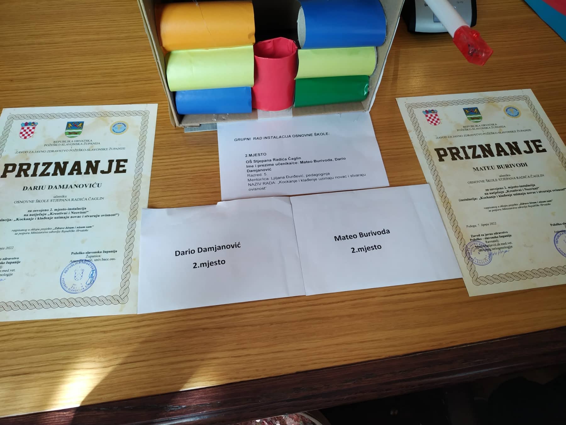 Učenici čaglinske škole tradicionalno sudjeluju na natječaju i osvajaju nagrade. Ove godine su naši petaši na inicijativu pedagoginje Ljiljane Đurđević koja je i voditeljica ŠPP, izradili radove na temu borbe protiv ovisnosti. Prvu nagradu osvojila je Ivona Švajda za instalaciju na temu štetnosti pušenja te je uz zahvalnicu osvojila i poklon bon u iznosu od 300 kuna u trgovini DM. Učenici Mateo Burivoda i Dario Damjanović su u skupnoj kategoriji osvojili 2. mjesto za instalaciju o štetnosti kockanja i klađenja, odnosno igara na sreću. Za svoj rad su primili zahvalnice i svaki bon od 200 kuna, također u DM-u.
