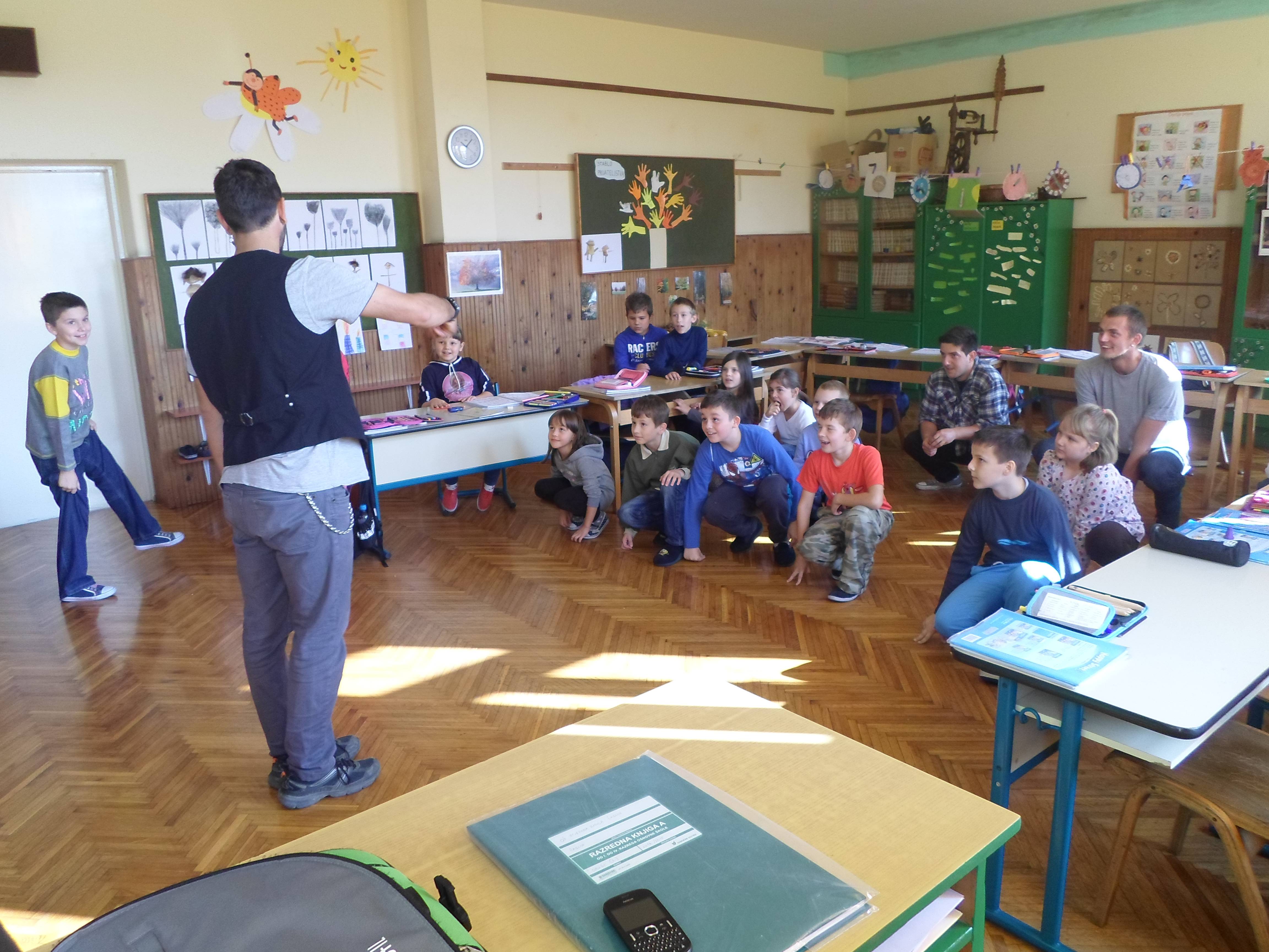Zahvaljujući dobroj suradnji škole i Eko centra Latinovac, volonteri iz Španjolske, Litve, Bosne i Hercegovine i Portugala su nazočili nastavi engleskog jezika, u razredima u kojima predaje učiteljica Akiko Nishimoto Damjanović. Učenici su plesali uz pjesme na španjolskom jeziku,imali kviz o poznavanju država iz kojih su volonteri,a također su igrali i popularnu igru ,,Država,grad,selo,,. Učenici su imali puno pitanja o značajkama zemalja iz kojih volonteri dolaze, a na koja su im gosti rado odgovarali. Obzirom kako su gosti nazočili satovima engleskog jezika,sva konverzacija je i bila na tom jeziku.