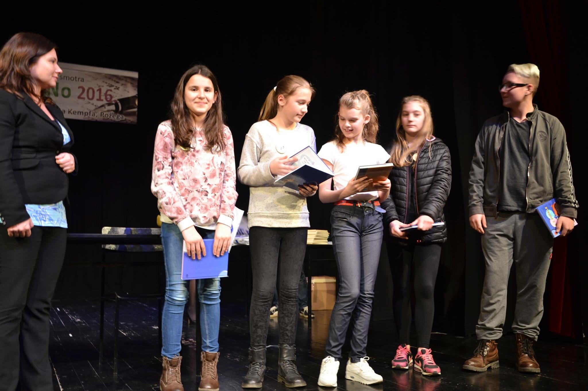 u literarnom izrazu učenik II. razreda Kristijan Burivoda koji je napisao sastavak „Snjegović i ja“. Mentorica mu je učiteljica Marina Kovačević. U pojedinačnom scenskom izrazu učenica VII.a razreda Doris Dragičević s monologom prema ulomku iz romana, „Bilješke jedne gimnazijalke“ književnice Nade Mihelčić. Mentor je pedagoginja Ljiljana Đurđević. U kategoriji skupnih scenskih izričaja predstavljali su nas učenici Ivan Nekić, Ivana Tušek, Claudia Pamer, Maja Stanković i Iva Vidmar. Njihova mentorica učiteljica Ivana Razumović je poznatu Ezopovu basnu „Lisica i roda“ preradila i u suvremenijem scenskom ruhu predstavila gledateljstvu i članovima Stručnog prosudbenog povjerenstva. Veliki pljesak i smijeh koji se čuo tijekom cijelog igrokaza dao je naslutiti kako je učiteljica „pogodila u žicu“ ukus publike i Stručnog povjerenstva, a ljepota i čarolija svake basne jest što je na njenom kraju pouka koja vrijedi za sva vremena. Tako se i iz ove basne dalo naučiti: „Ne čini drugome što ne želiš da tebi čine“.