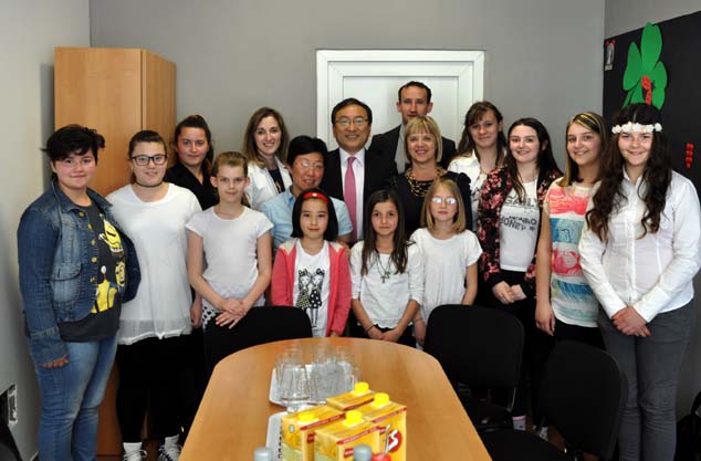Učenici su veleposlaniku priredili program dobrodošlice. Tako su učenice Gabrijela Josipović i Lucija Brletić veleposlaniku uputile riječi pozdrava i predstavile školu na japanskom jeziku. Riječi dobrodošlice uputila je i ravnateljica Švajda također na japanskom jeziku što je na neki način bilo iznenađenje veleposlaniku Keiji Ideu.