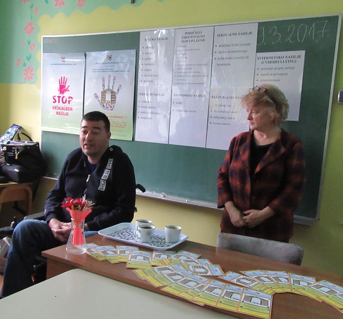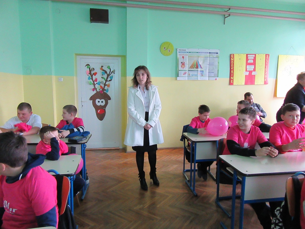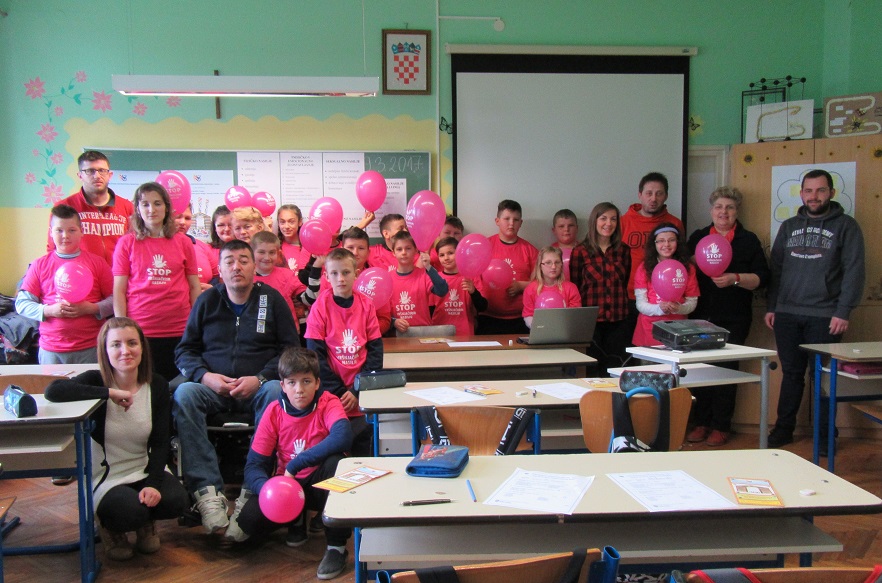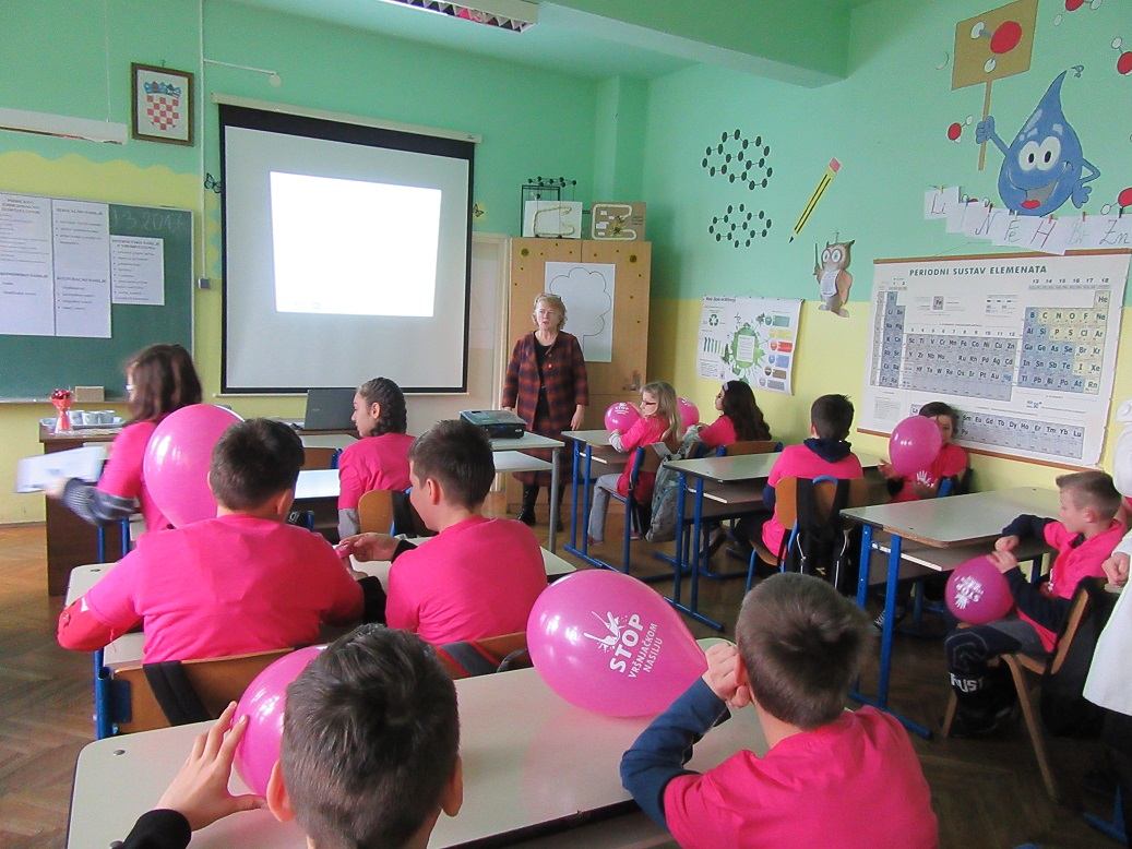 U našoj školi ugostili smo predsjednicu Saveza društava distrofičara Hrvatske gđu Maricu Mirić i njezine dvije suradnice. Prije nekoliko tjedana uputili su nam dopis kako bi željeli predstaviti Projekt u području prevencije nasilja među djecom ,,Različitim koracima do jednakosti 2“ i educirati učenike što je vršnjačko nasilje i kako ga spriječiti. Predavanje je namijenjeno učenicima petih razreda. Gošće su svakom učeniku poklonile ružičastu majicu s porukom ,,Stop vršnjačkom nasilju“ i balon iste boje i s istom porukom. Saznali smo da Savez čini 28 lokalnih udruga s područja Republike Hrvatske koje okupljaju osobe oboljele od mišićne distrofije i srodnih neuromišićnih bolesti. Financijsku potporu i suglasnost dobili su od Ministarstva za demografiju, obitelj, mlade i socijalnu politiku.
