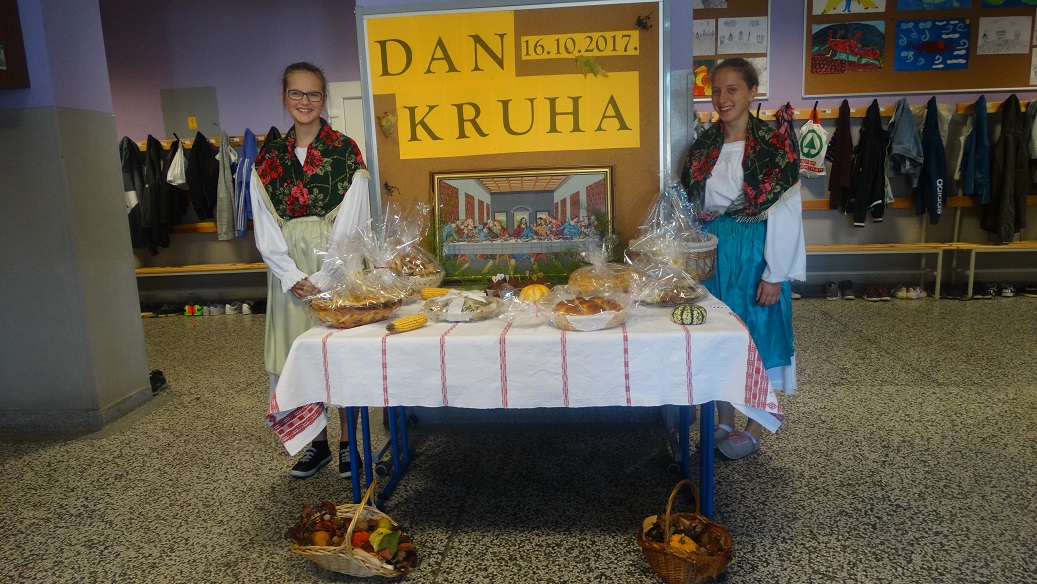 U našoj državi se u listopadu tradicionalno obilježava Dan kruha-dan zahvalnosti za plodove zemlje. Ove godine za organizaciju obilježavanja Dana kruha bio je zadužen vjeroučitelj Krunoslav Pečur. U kraćem kulturno-umjetničkom programu koji su vodile osmašice Sara Hrčka i Petra Vojak, sudjelovale su članice dramske skupine koju vodi pedagoginja Ljiljana Đurđević. Tako su pjesmu Podijeli kruh krasnoslovile Dana Damjanović, Martina Miškić i Lorena Švajda, a pjesmu Malo zrno učenice Andrea Rogalo i Nada Stjepanović. Učiteljica engleskog jezika Marija Kiralj vodi dramsku skupinu na engleskom jeziku te smo poslušali učenike Marka Kuzmara, Lorenu Švajda, Teu Topić i Marka Žišku koji su krasnoslovili pjesmice na engleskom jeziku.