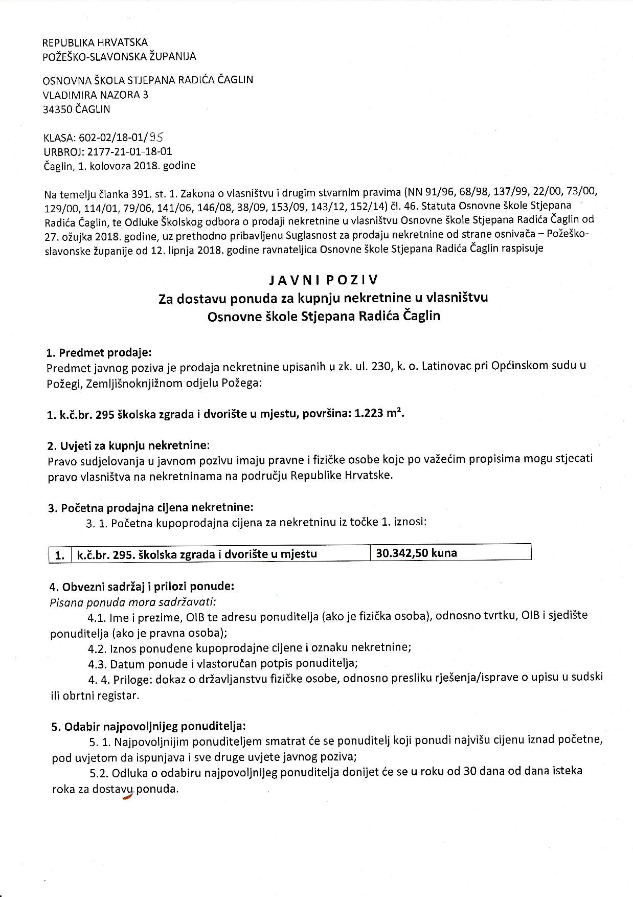 Javni poziv za dostavu ponuda za kupnju nekretnine u vlasništvu Osnovne škole Stjepana Radića Čaglin
