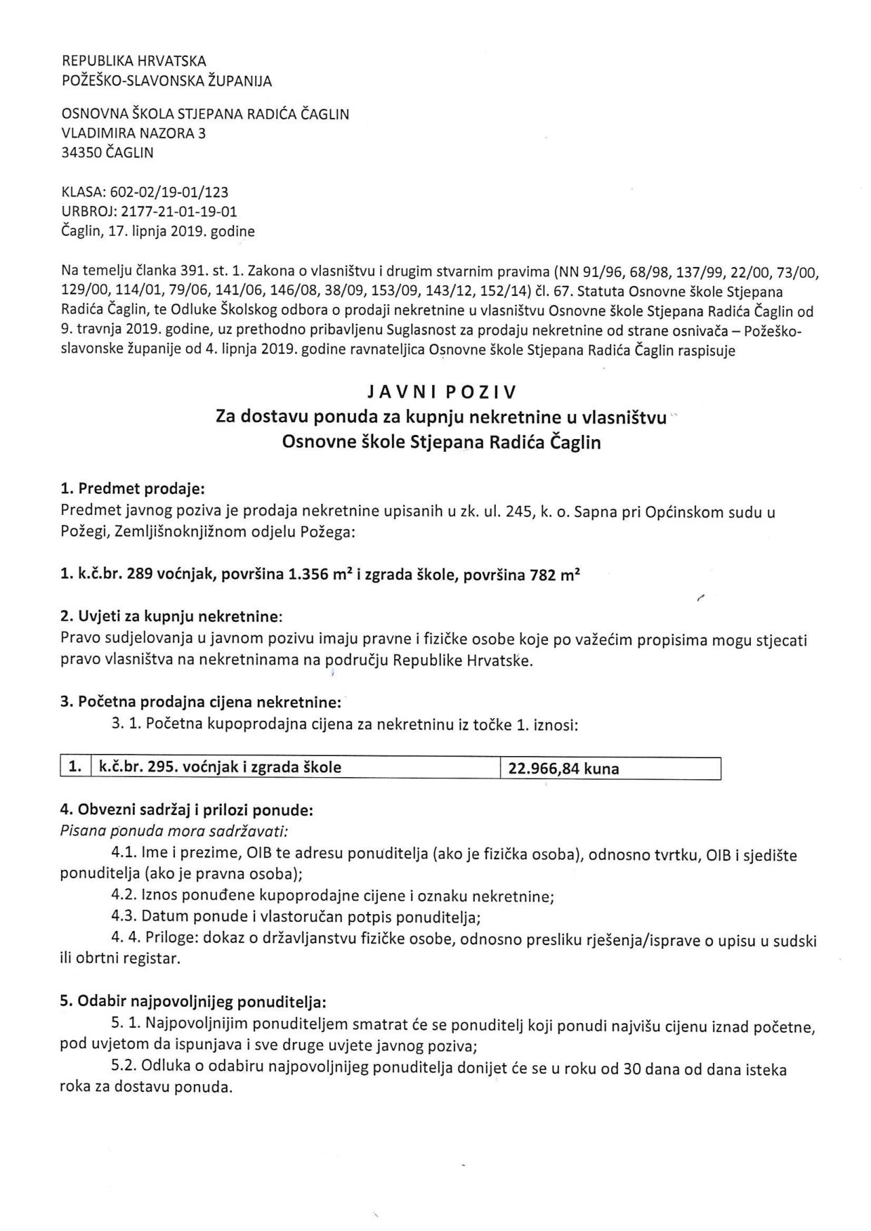 Javni poziv za dostavu ponuda za kupnju nekretnine u vlasništvu Osnovne škole Stjepana Radića Čaglin