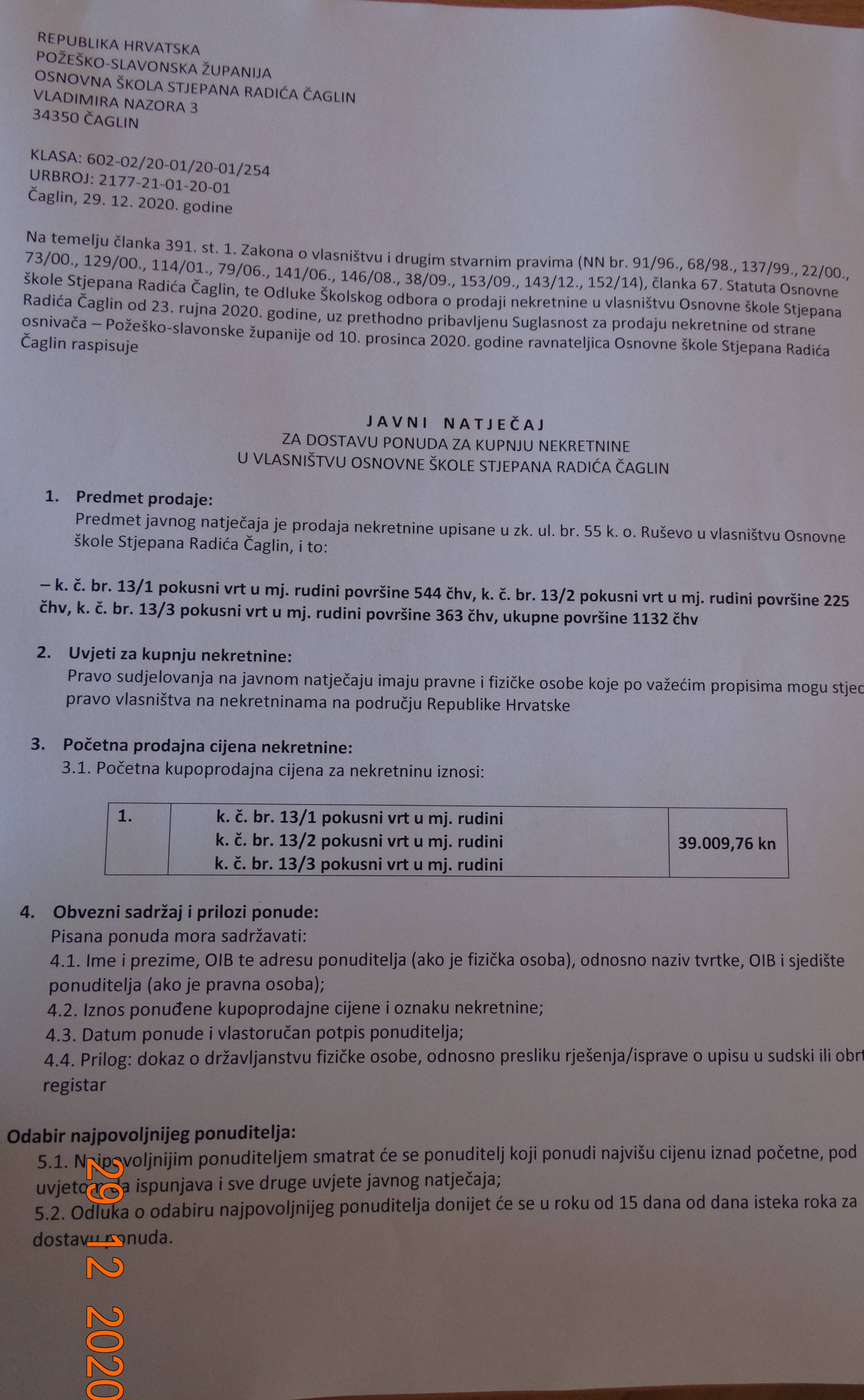 //JAVNI NATJECAJ ZA DOSTAVU PONUDA ZA KUPNJU NEKRETNINE U VLASNISTVU OSNOVNE SKOLE STJEPANA RADICA CAGLIN.pdf
