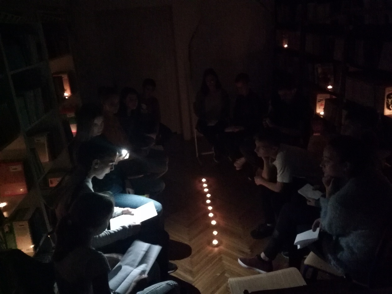 Poslije vrlo zanimljivog čitanja i razmjenjivanja najdražih dijelova pojedine knjige počastili smo se slatkišima, grickalicama i sokovima te dočekali ono što smo svi nestrpljivo iščekivali – iznenađenje! Učitelj je u naše učionice sakrio kartice s crtežima mačke, rupčića, šume i violine te je svatko morao pronaći jednu od njih. Svi smo brzinom munje trčali prema prizemlju u učionice. S obzirom da je u školi zabranjeno trčanje niz stube, bio je to pravi gušt. Prema tome koji crtež je bio na našoj kartici, bili smo raspoređeni u grupe. Svaka grupa je dobila svoju strašnu priču koju je morala naučiti čitati i učionicu za uvježbavanje. Dok su neki uvježbavali svoje tekstove, drugi su kucali na vrata ostalih skupina pokušavajući ih tako prestrašiti. Za to vrijeme učitelj Emir je pripremio knjižnicu za čitanje strašnih priča. Posvuda je stavio svijeće i trake za zabranu pristupa, pustio je strašnu glazbu, a pored svega toga meni je za oko zapeo sat koji je, radi još boljeg dojma, stajao ukoso. Atmosfera je bila odlična, ali pošto je već bio 21 sat, a nas je još čekao dvosatni film, učitelj je morao ukratko prepričati svaku priču kako bismo sve stigli.