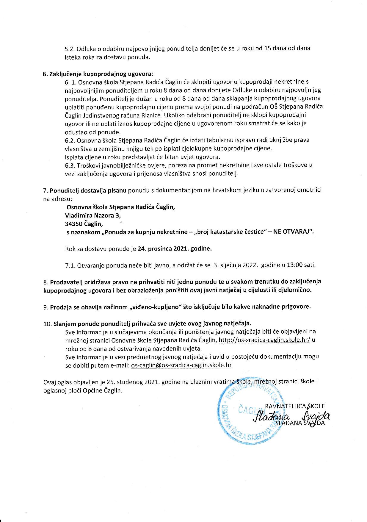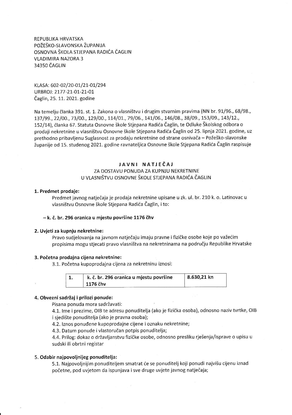 JAVNI NATJEČAJ ZA DOSTAVU PONUDA ZA KUPNJU NEKRETNINE U VLASNIŠTVU OSNOVNE ŠKOLE STJEPANA RADIĆA ČAGLIN