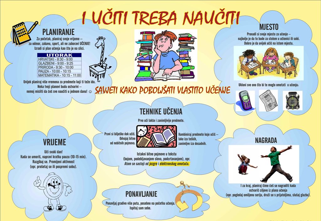 Napravite plan što i kada učiti. Gradivo koje vam je teže učite prije. Čitajte naglas kako biste čuli sebe. Odgovorite na pitanja na kraju lekcije. Za uspjeh u učenju nije važna količina vremena utrošena za učenje, već je važan raspored vremena i način učenja.