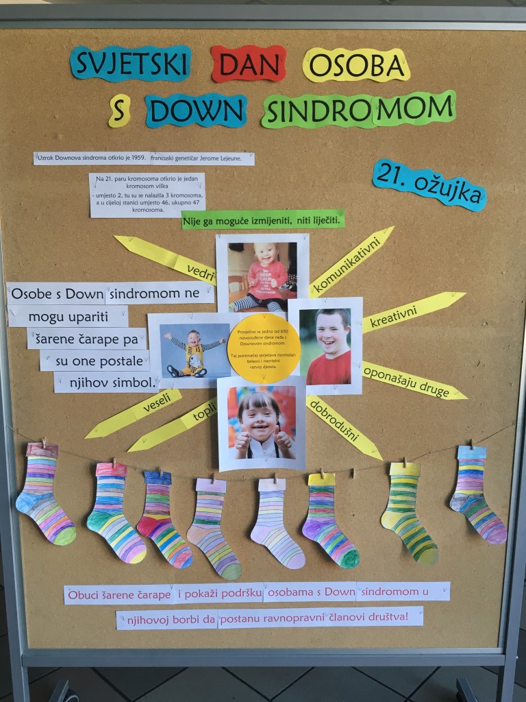 Budući da većim razumijevanjem i poboljšanjem njihovog položaja u društvu možemo poboljšati kvalitetu života osoba sa sindromom Down i naša je Škola odlučila obilježiti ovaj dan. Pedagoginja je izradila pano na kojemu su učenici mogli pronaći najvažnije činjenice o ovom sindromu te karakteristike ljudi koji su s tim sindromom rođeni. Također, kao jedna od zanimljivosti, istaknuta je i činjenica da osobe s Down sindromom ne mogu upariti šarene čarape.