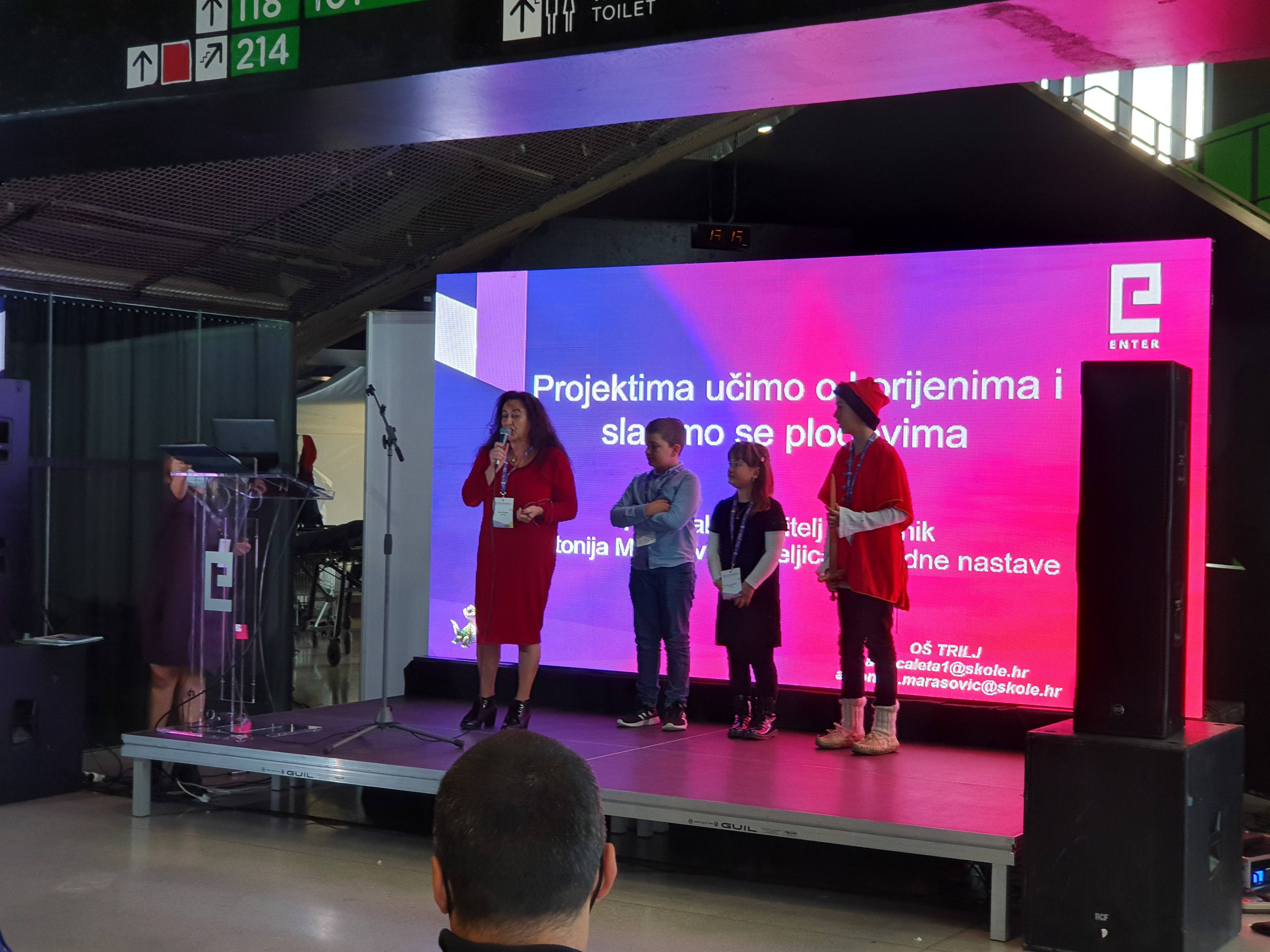 Naše su učiteljice Ana Ćaleta, Antonija Marasović, Anita Čota, Mia Ćuk, Danijela Krivić i Ivana Marić Zerdun pronašle motivaciju za sudjelovanje na ENTER konferenciji u radu s učenicima. Međunarodna znanstveno-stručna konferencij Ima razvojnu, edukacijsku i promocijsku ulogu za sve dionike odgojno-obrazovnog sustava koji na bilo koji način sudjeluju u ostvarenju potencijala visokomotiviranih i potencijalno darovitih učenika. Učiteljice Ana i Antonija s učenicima 3. a razreda, Ivanom Đonlić, Maksimom Marasovićem i Jakovom Šušnjarom sudjelovali su pod temom ,,Projektima učimo o korijenima i sladimo se plodovima”, misleći pritom na prošlost i kulturnu baštinu koja daje ,,plodove“ svojim značajem, prvenstveno u turizmu. Učiteljice Anita, Mija, Danijela i Ivana s učenicom 8. b razreda Gabrielom Pavlinušić sudjelovale su pod temom „Klub istraživača – projekti u radu s darovitom djecom“. Kroz Klub istraživača realizirana je interdisciplinarna projektna aktivnost iz područja kemije, geografije, fizike i povijesti. Zaključna aktivnost provedena je putovanjem vlakom Split – Knin s ciljem skretanja pažnje na željeznicu kao održivu, inovativnu i sigurnu vrstu prijevoza. Učenica Gabriela predstavila je istraživačko putovanje koje je započelo u Splitu do Perkovića, s presjedanjem za Knin.
