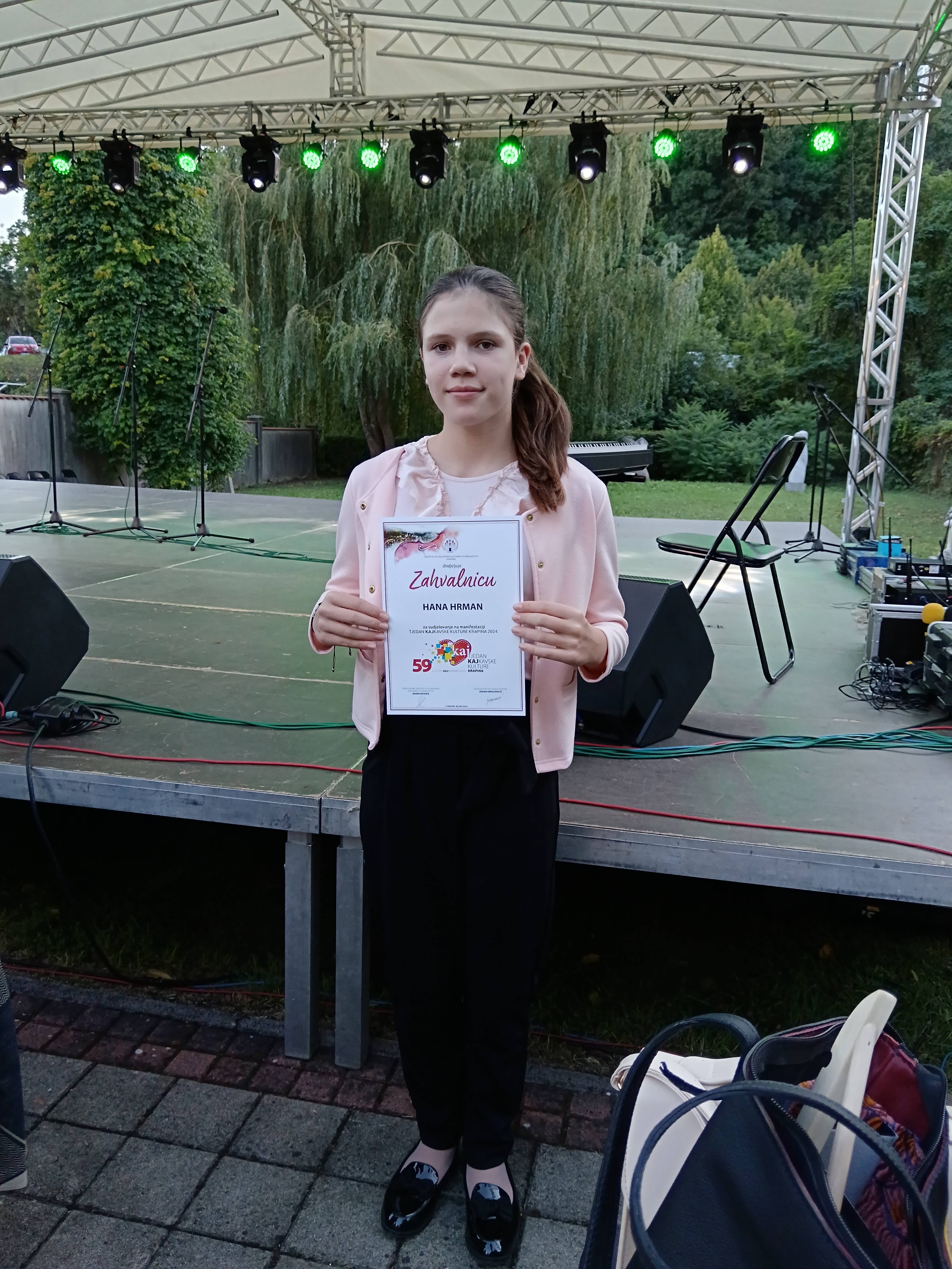 Među odabranima su i učenice naše škole: Hana Hrman s pjesmom Vu mojemu kraju i Mia Sabol s pjesmom Deca v selu. Hanina pjesma izabrana je za izvođenje na Recitalu dječje kajkavske poezije koji se odvijao u divnom ambijentu Galerije grada Krapine 10. rujna 2024. godine. Mentori su učitelji hrvatskog jezika Maja Mlakar i Mihael Novosel.