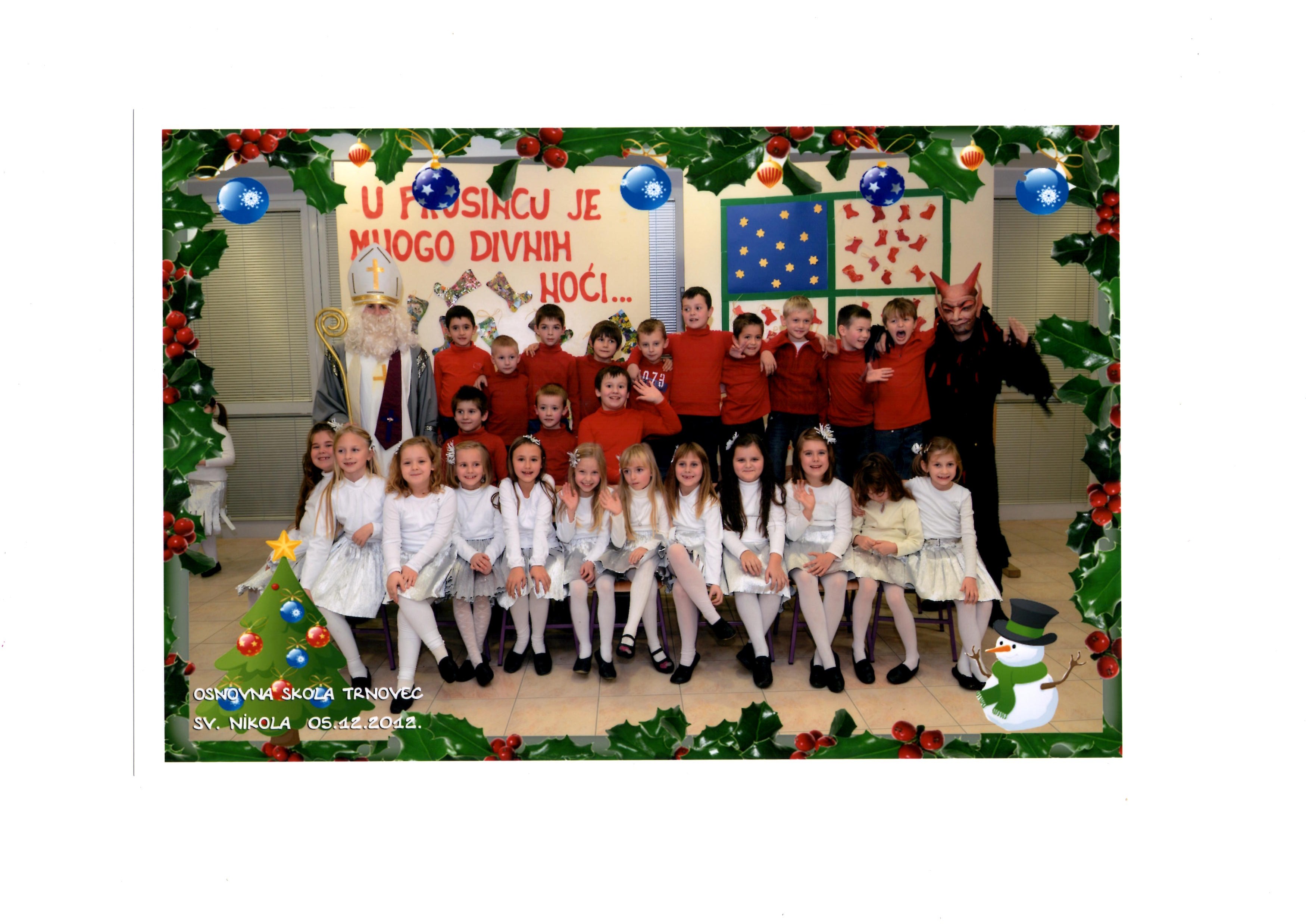 Ove godine, priredba se održala 5. prosinca u 17,00 sati u prostoru buduće blagovaonice. Nositelji priredbe bili su učenici 1. razreda. Počasni gosti priredbe su roditelji prvašića, budući da je to prvi javni nastup njihovih učenika. Uz prvašiće, na priredbi su nastupali: pjevački zbor škole, tamburaški orkestar te sastav blok flauta. Njih je uvježbao novi učitelj glazbene kulture Mladen Gložinić. Naravno, na priredbi se pojavio Sveti Nikola, glavom i bradom i nezaobilazni Krampus. Nikola i njegovi pomagači donijeli su darove za učenike razredne nastave, po jedan adventski kalendar za svakoga. Donijeli su i jedan veliki zajednički dar za sve učenike: projektor i dokument kameru. U nabavi ovog vrijednog poklona Nikoli je pomogla Općina te joj iskreno zahvaljujemo. Dan nakon priredbe, 6. prosinca, slatkiš su dobili i svi učenici predmetne nastave. I na njih je mislio Sveti Nikola.