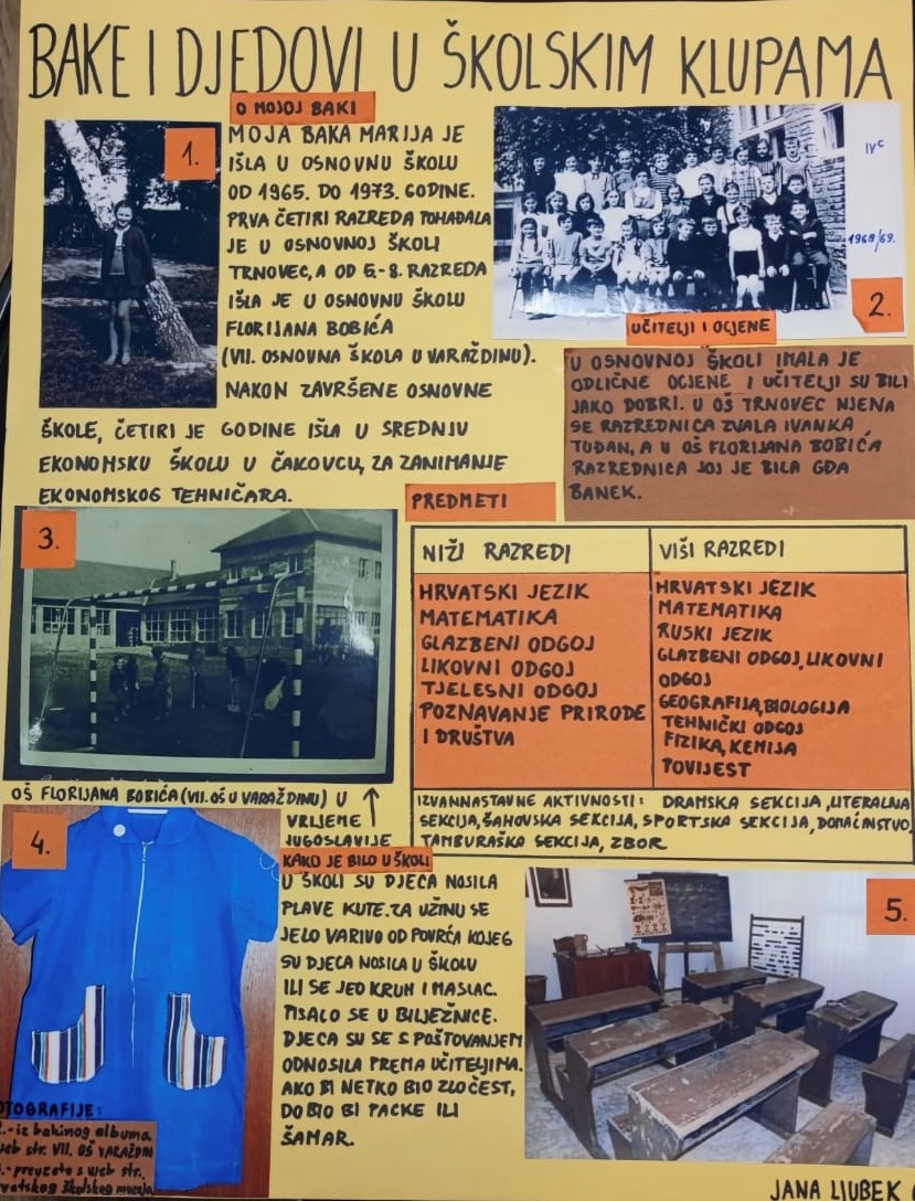 Učenici 6. a i 6. b razreda na satu Hrvatskog jezika sudjelovali su u istraživačkom projektu „Bake i djedovi u školskim klupama“. Razgovarali su sa svojim bakama i djedovima, ali i roditeljima i saznali kako je izgledalo školovanje u njihovo vrijeme, kakvi su bili učitelji, koliko je trajao nastavni dan, koje su predmete imali, što im se u školi sviđalo, a što nije, što je drukčije nego u današnjoj školi, jesu li nekada kažnjavali učenike, jesu li učenici nosili odore ili kute i druge zanimljivosti. Pronašli su stare fotografije, bilježnice i svjedodžbe.
