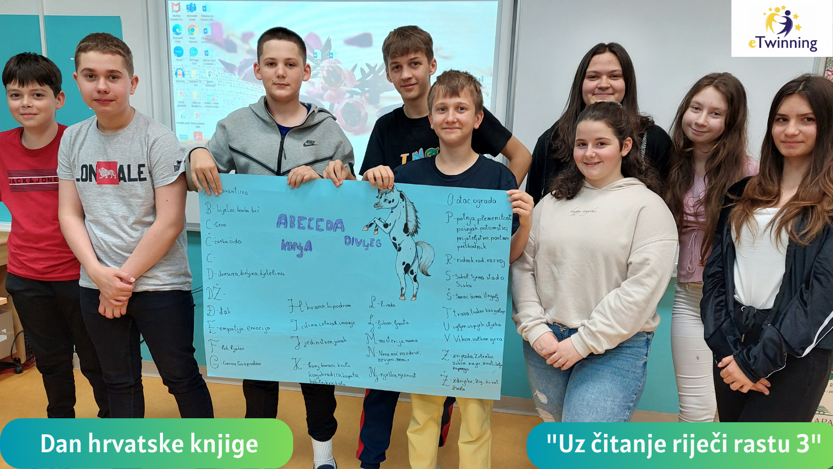 Učenici sedmih razreda čitali su djelo Divlji konj Božidara Prosenjaka i zajedno napravili abecedu toga djela. U manjim grupama dobili su nekoliko slova abecede, a uz njih su napisali pojmove koji ih asociraju na pročitano djelo.
