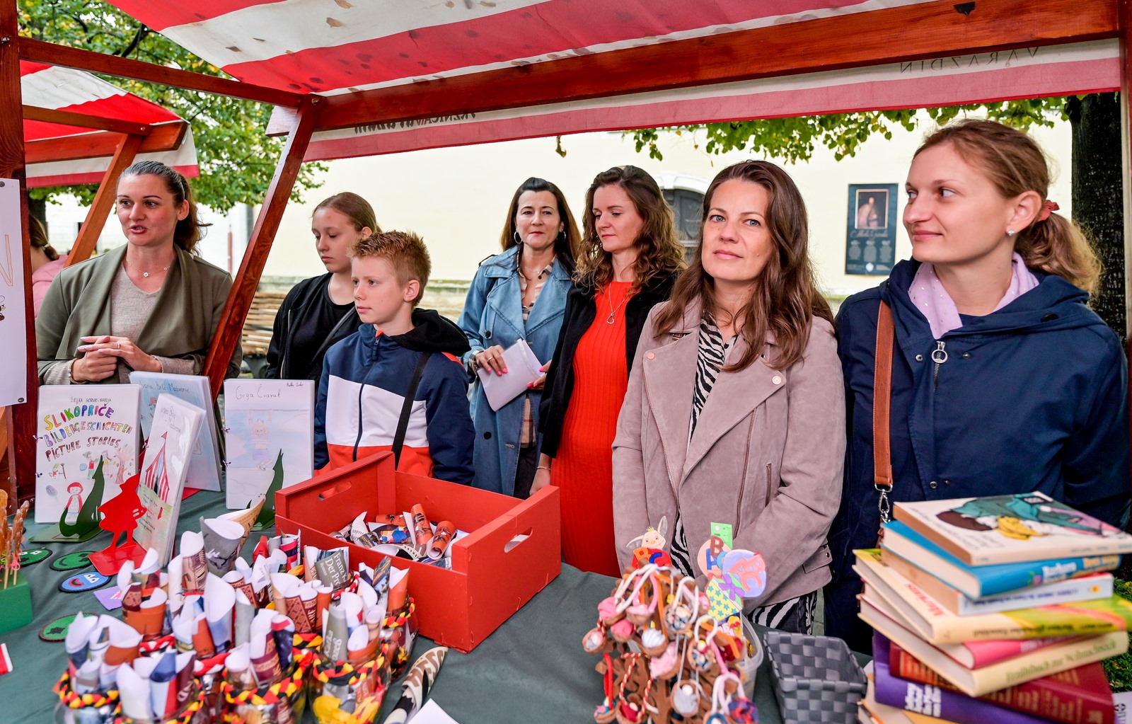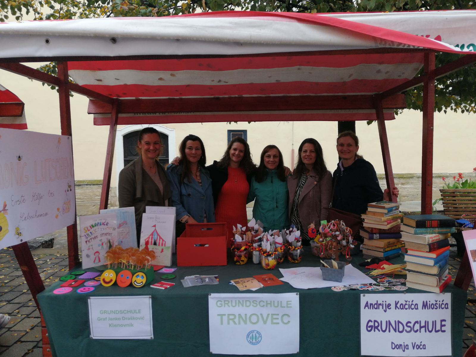 Iako je bilo vrlo tmurno, kišovito i oblačno vrijeme, svi su ljudi imali osmijeh od uha do uha. Ove godine naša škola na štandu imala je načitane zimnice. Riječ je o staklenkama u kojima su se nalazile naslovnice knjiga na njemačkom jeziku i iza njih poznate izreke tih spisatelja oko kojih je bio zamotan krep papir u raznim oblicima koje su radili učenici 5. i 6. a razreda. Na štandovima drugih škola bilo je bojanki, knjiga, kemijskih olovaka, označivača, cvijeća, narukvica, bombona, privjesaka i još puno, puno toga… i sve to besplatno!