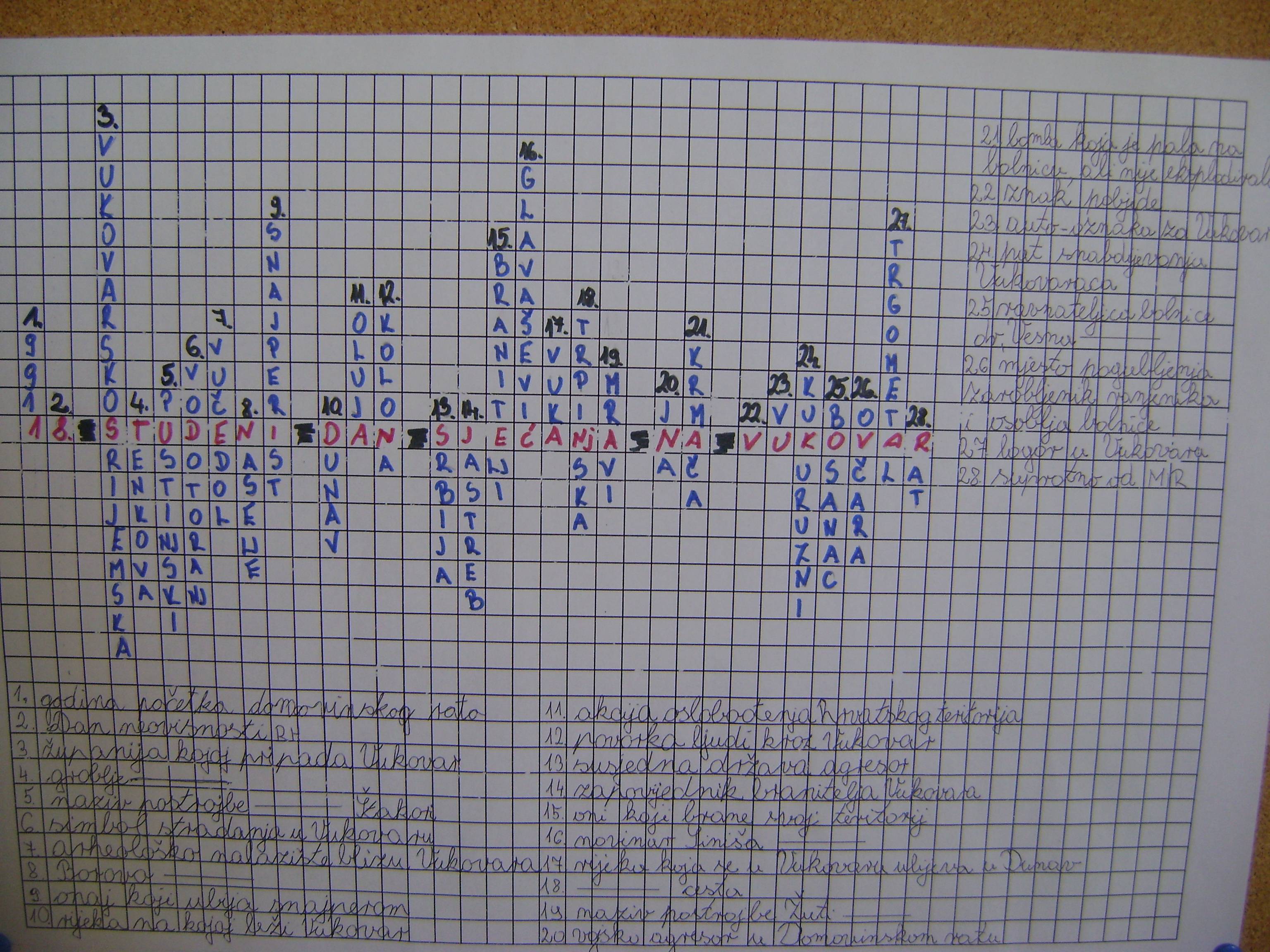 Dan sjećanja na žrtvu Vukovara obilježili smo danas na nivou škole. No, učenici 5.b razreda taj su dan obilježili i na posljednjem satu razrednika, Najprije su u školskoj knjižnici pogledali vrlo poučan i potresan film o Vukovaru, a nakon toga su u svojoj učionici zajedno osmislili križaljku u kojoj su koristili pojmove vezane uz Vukovar i njegovo ratno stradavanje.Neke od pojmova znali su otprije, a većinu su pojmva saznali upravo iz filma. Preporučujemo svima koji još nisu da pogledaju film o gradu Vukovaru - simbolu hrvatske slobode.