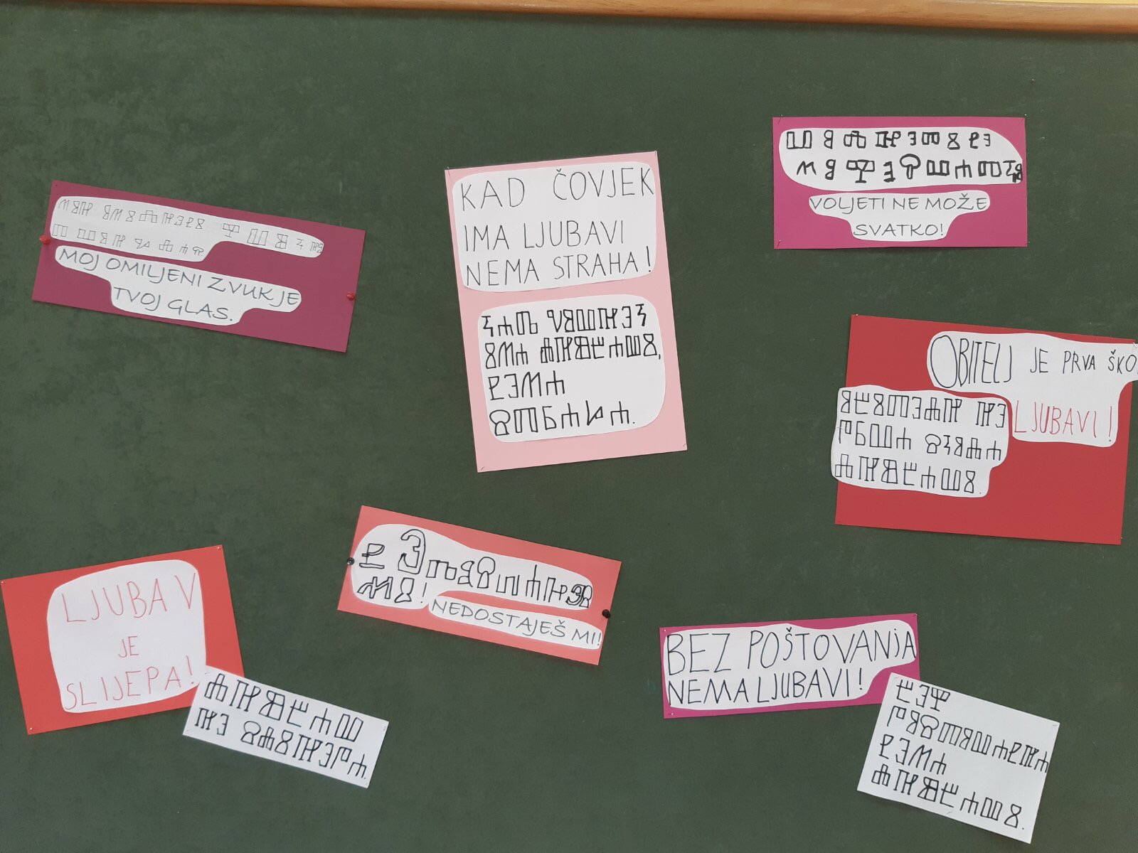 U sklopu projekta "Glagoljica - upoznajmo prvo hrvatsko pismo" učenici iz produženog boravka okušali su se u prevađanju i pisanju ljubavnih poruka s glagoljice na latinicu i obrnuto. Taj tematski dan povezali smo s nadolazećim nam blagdanom Valentinova i Danom hrvatske glagoljice koji se obilježava 22. veljače.