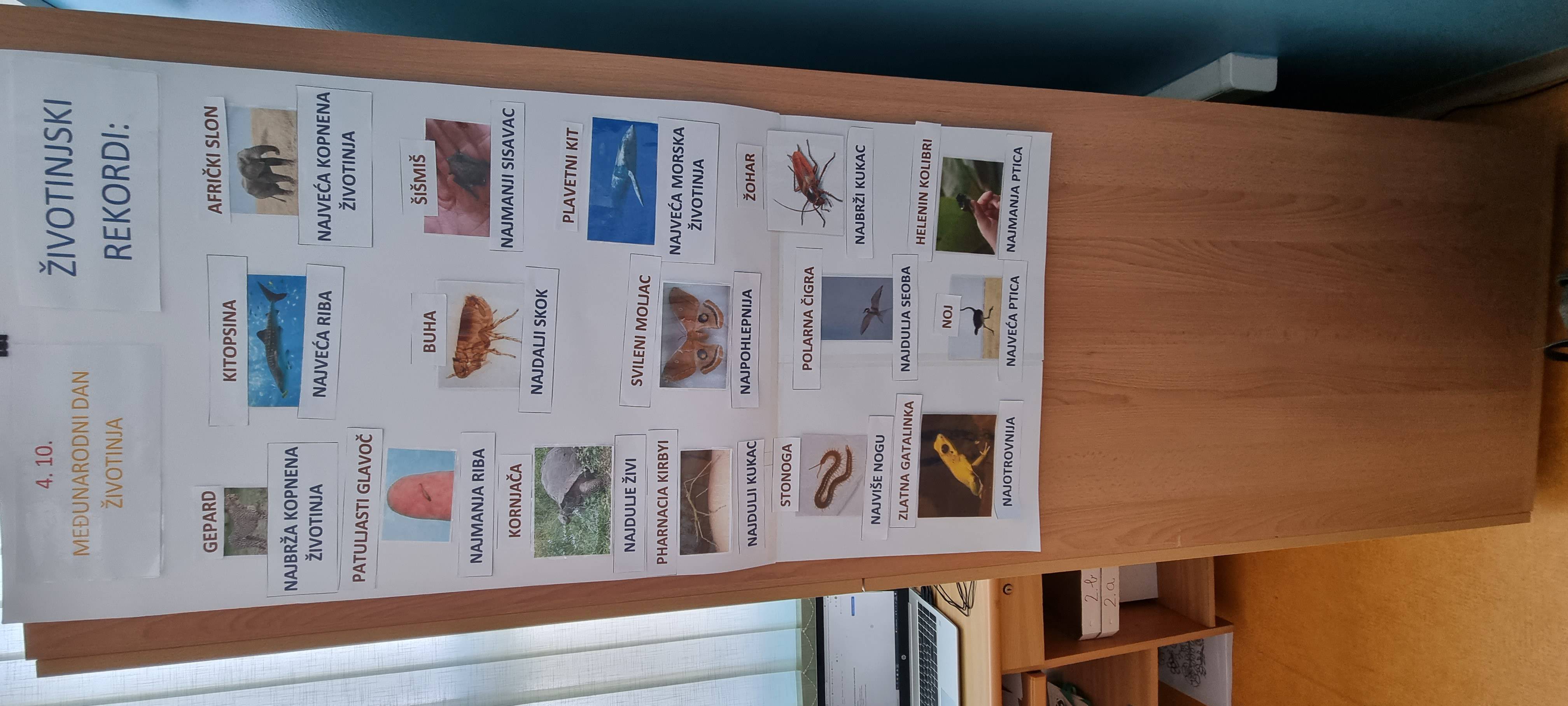Organizirali smo natjecanje 3.a i b razreda u poznavanju ŽIVOTINJSKIH REKORDA. Cilj je bio točno složiti sliku i naziv životinje sa njezinom rekordnom osobinom. Dobili smo naravno pobjednika, ali najvažnije je to da smo i nešto naučili o osobinama životinja.