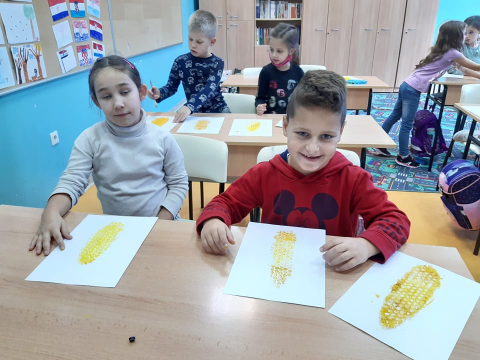 Da ne bismo samo puno učili, kroz likovnu radionicu smo se zabavili. Koristeći tempere i zaštitnu pucketajuću foliju, otiskivanjem, načinili smo predivne kukuruze.