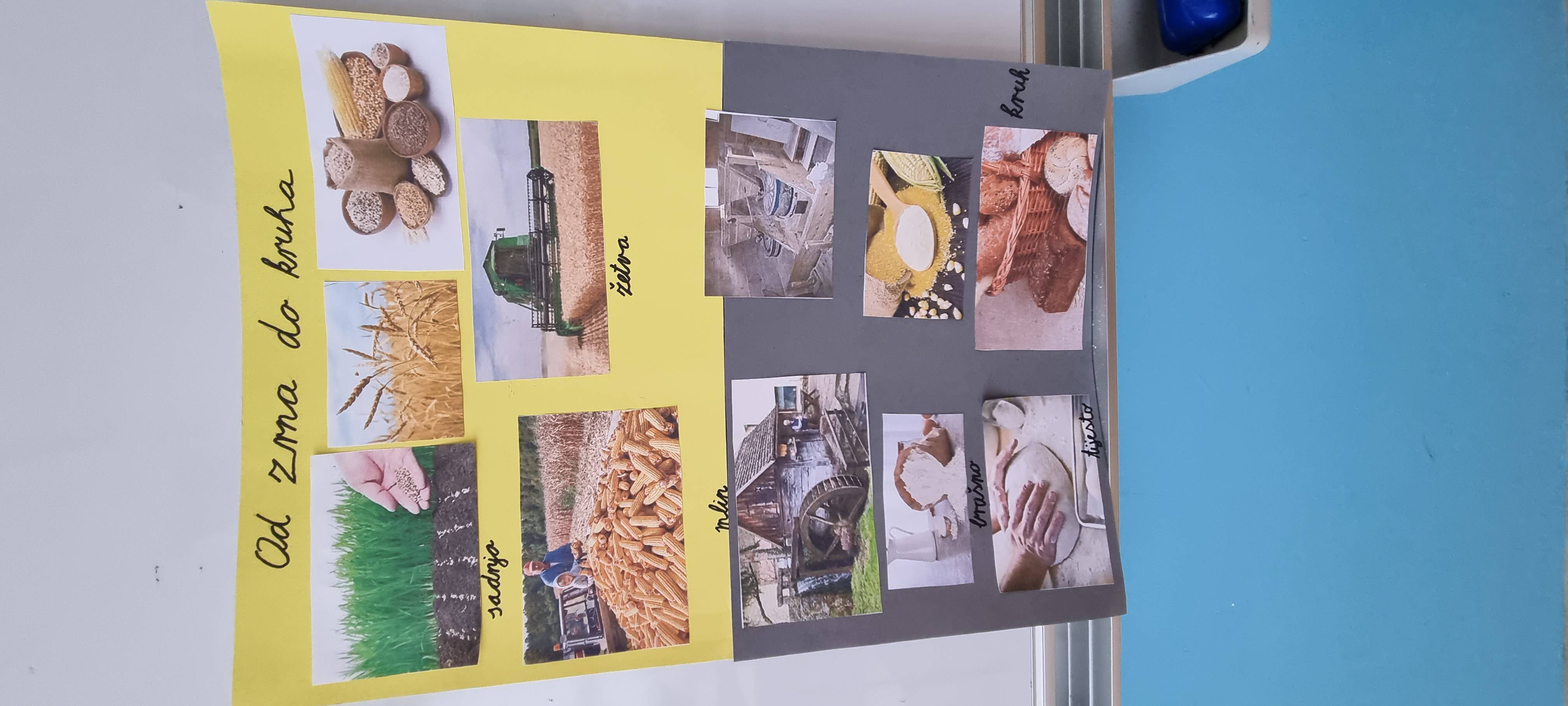 Razgovarali smo o kruhu, što je potrebno za izradu kruha, od kojih se žitarica dobiva brašno. Zajedno smo napravili plakat OD ZRNA DO KRUHA.