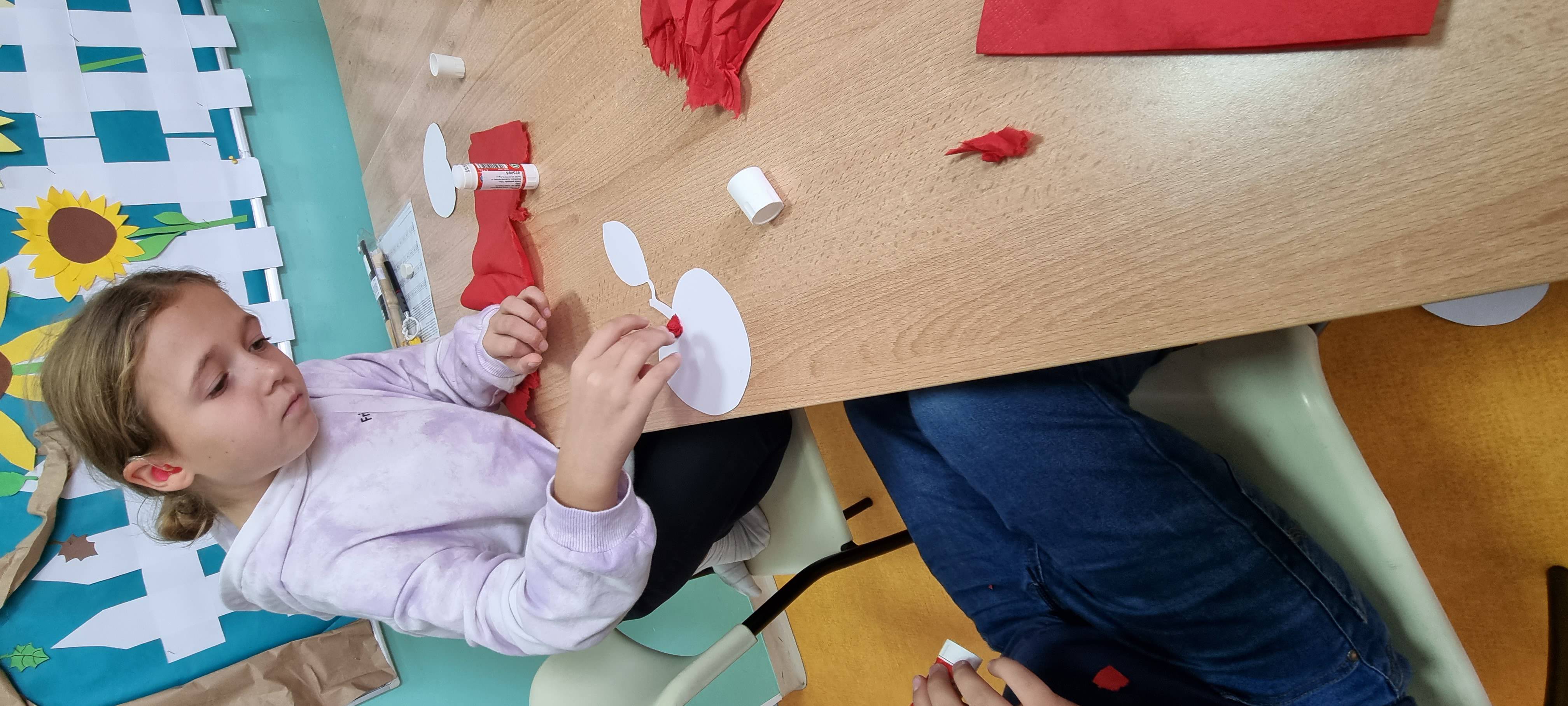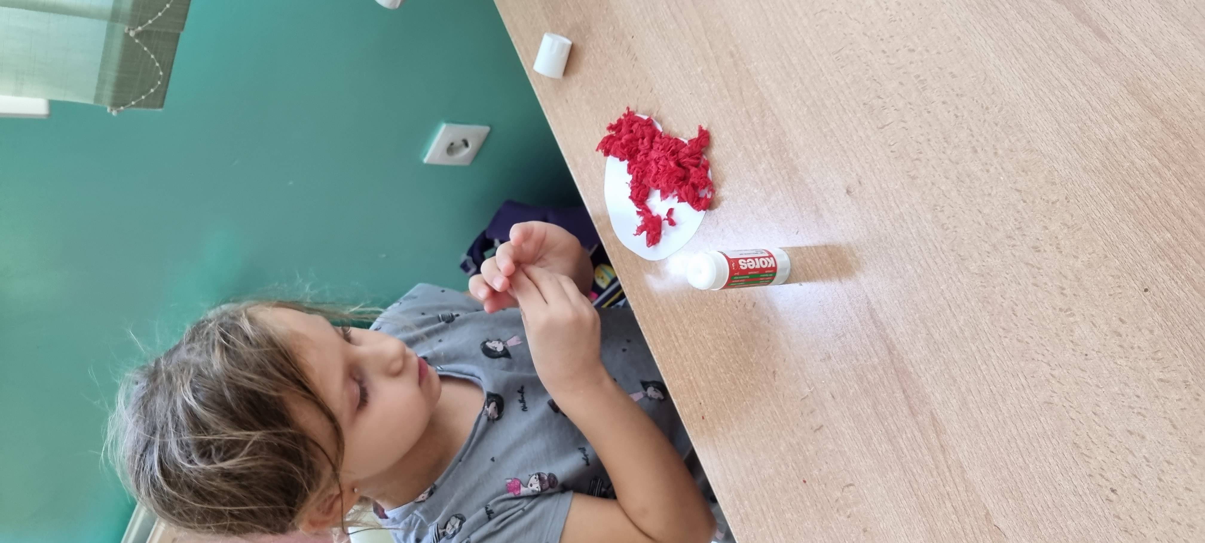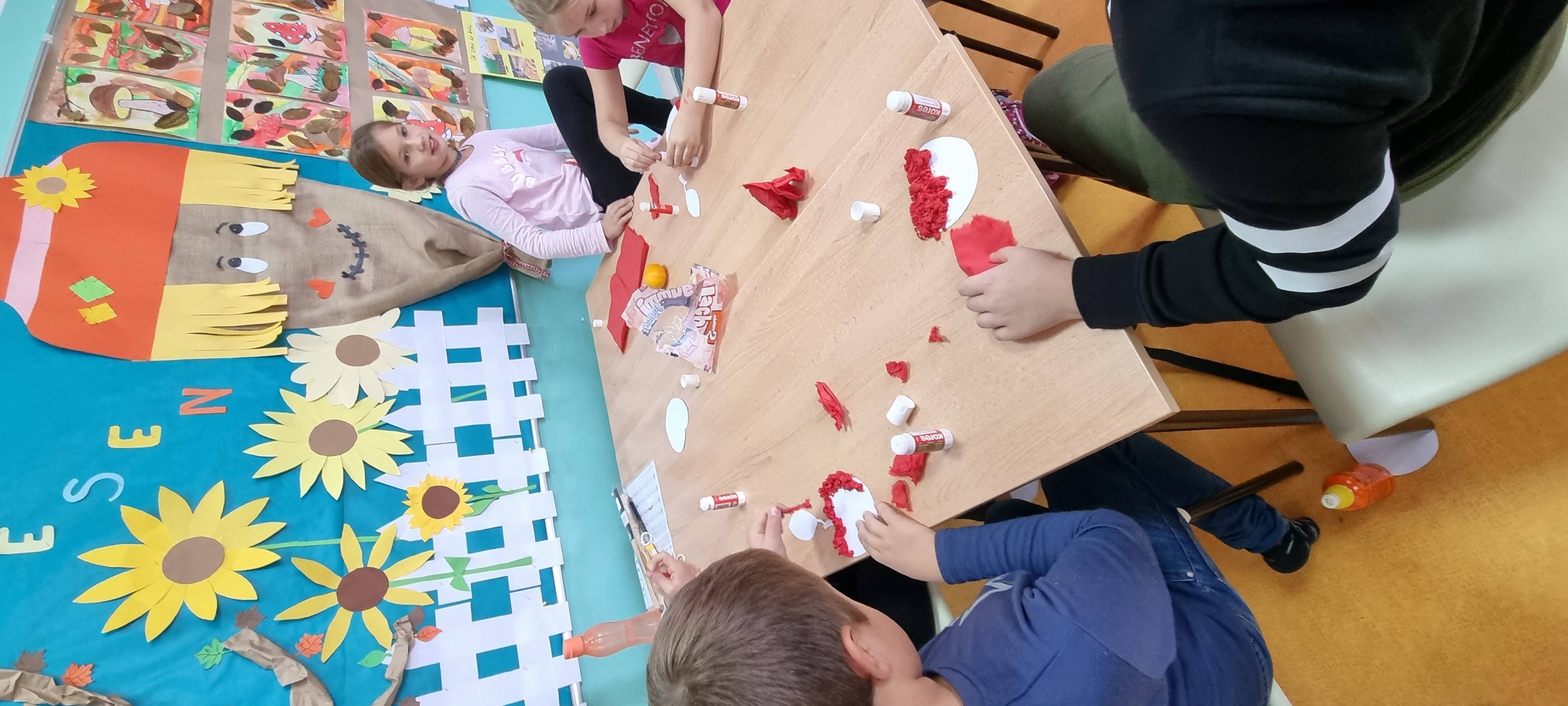 Likovna aktivnost: izrada jabuke (crvena salveta i ljepilo). Na izrezani papir oblika jabuke učenici su lijepili kuglice koje su dobili od komadića salvete.