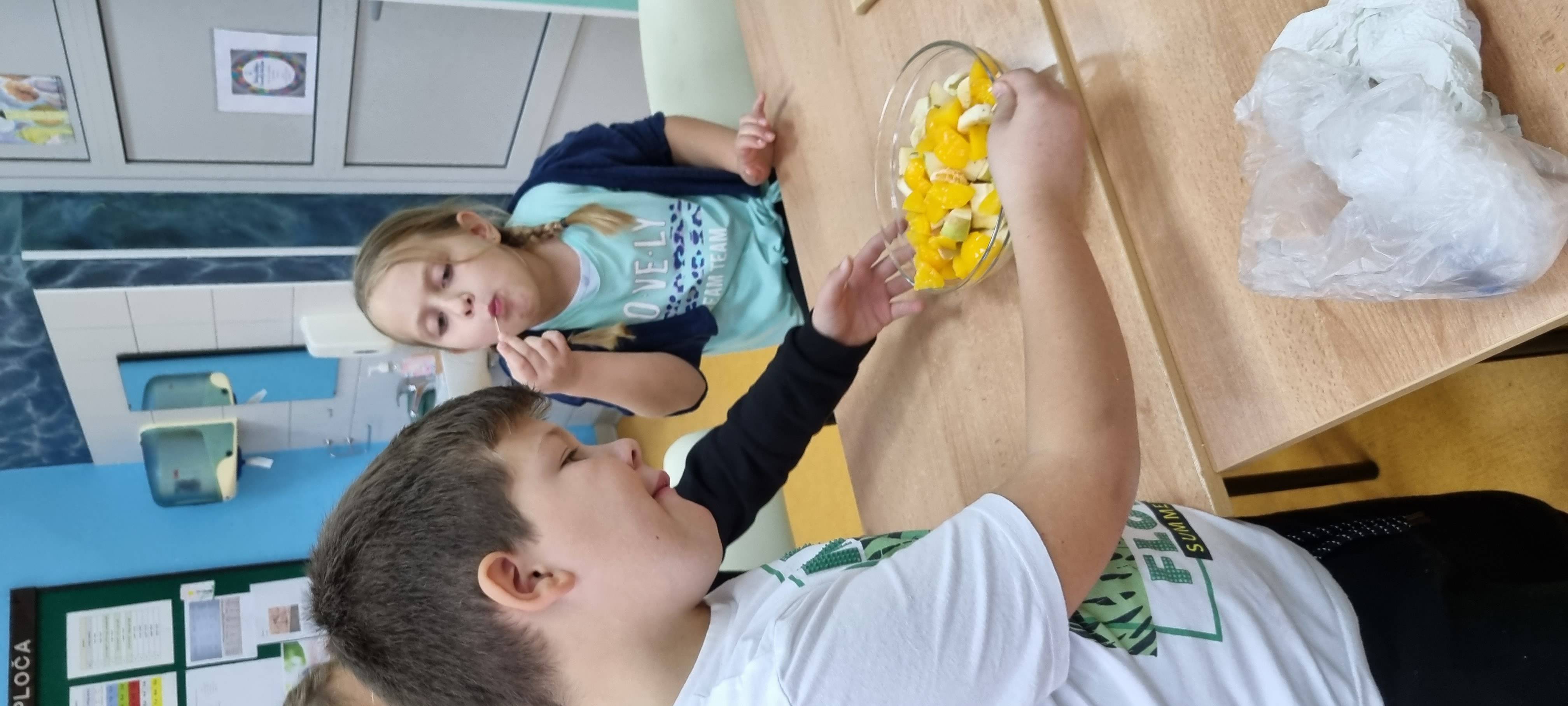 Voće (jabuka, banana, grožđe, mandarina, breskva, kruška) smo najprije oprali ili ogulili, a zatim rezali na komadiće i na kraju se njime zasladili.