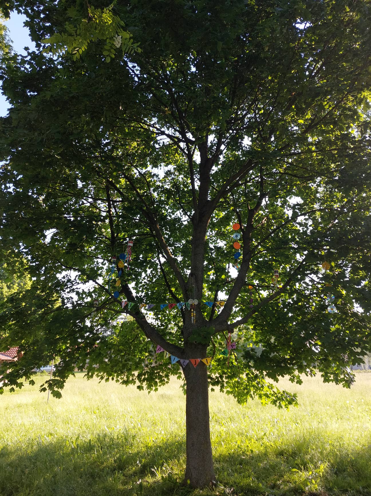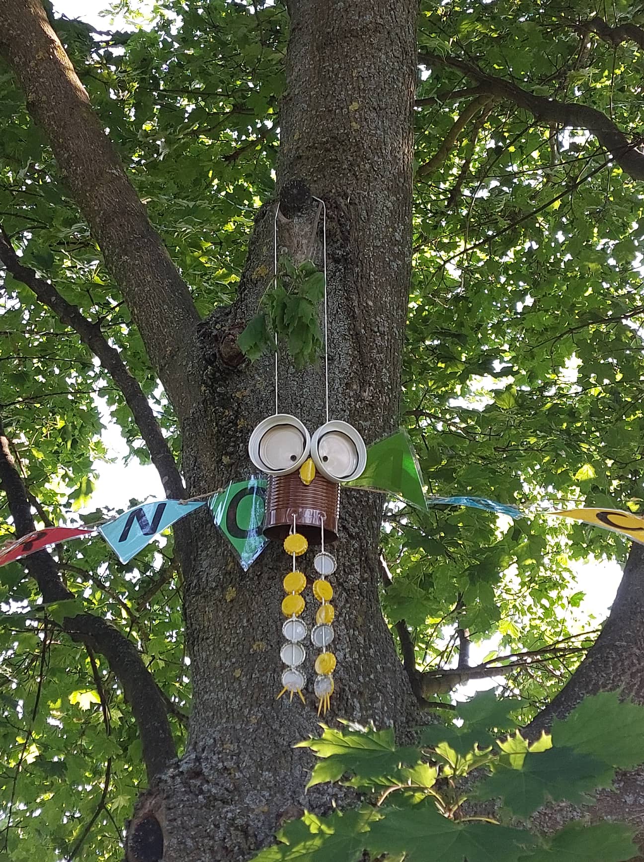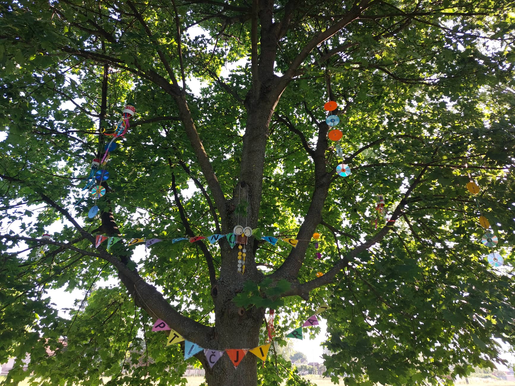 Za uređenje krošnje stabla koju smo nazvali „Ptičji raj“ izradili smo prekrasne šarene mobile, a ujedno smo i reciklirali stare limenke, plastične poklopce i CD-e.