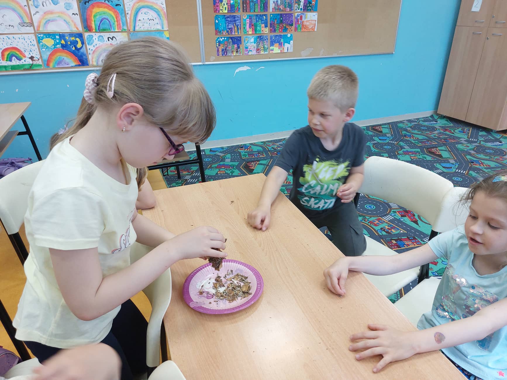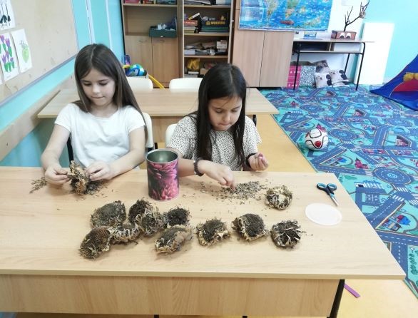 Kad smo već pripremili hranilice, trebali smo i hranu za ptice. Zasukali smo rukave te smo iz suhih suncokreta vadili sjemenke.